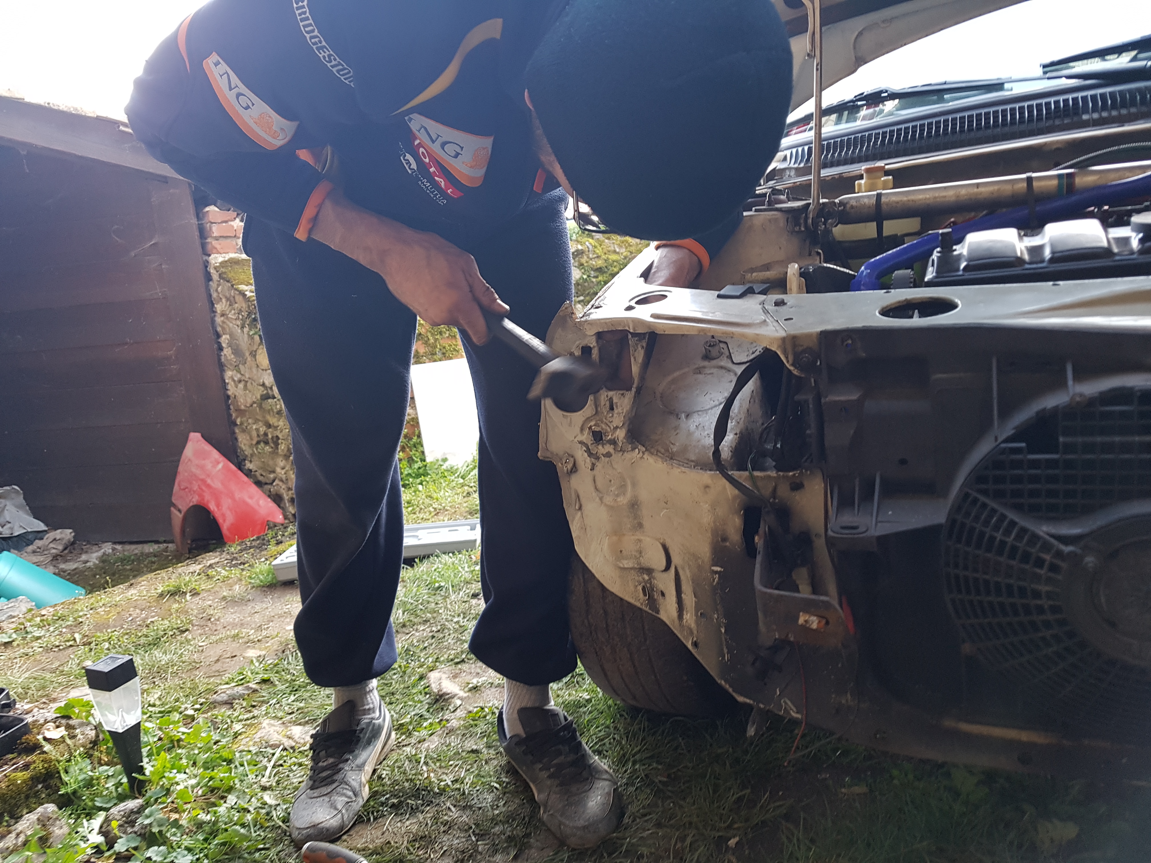 Démontage Puis Stef attaque le redressage de la face avant, et c'est là où tu restes admiratif... Où tu comprends qu'être carrossier c'est un métier...