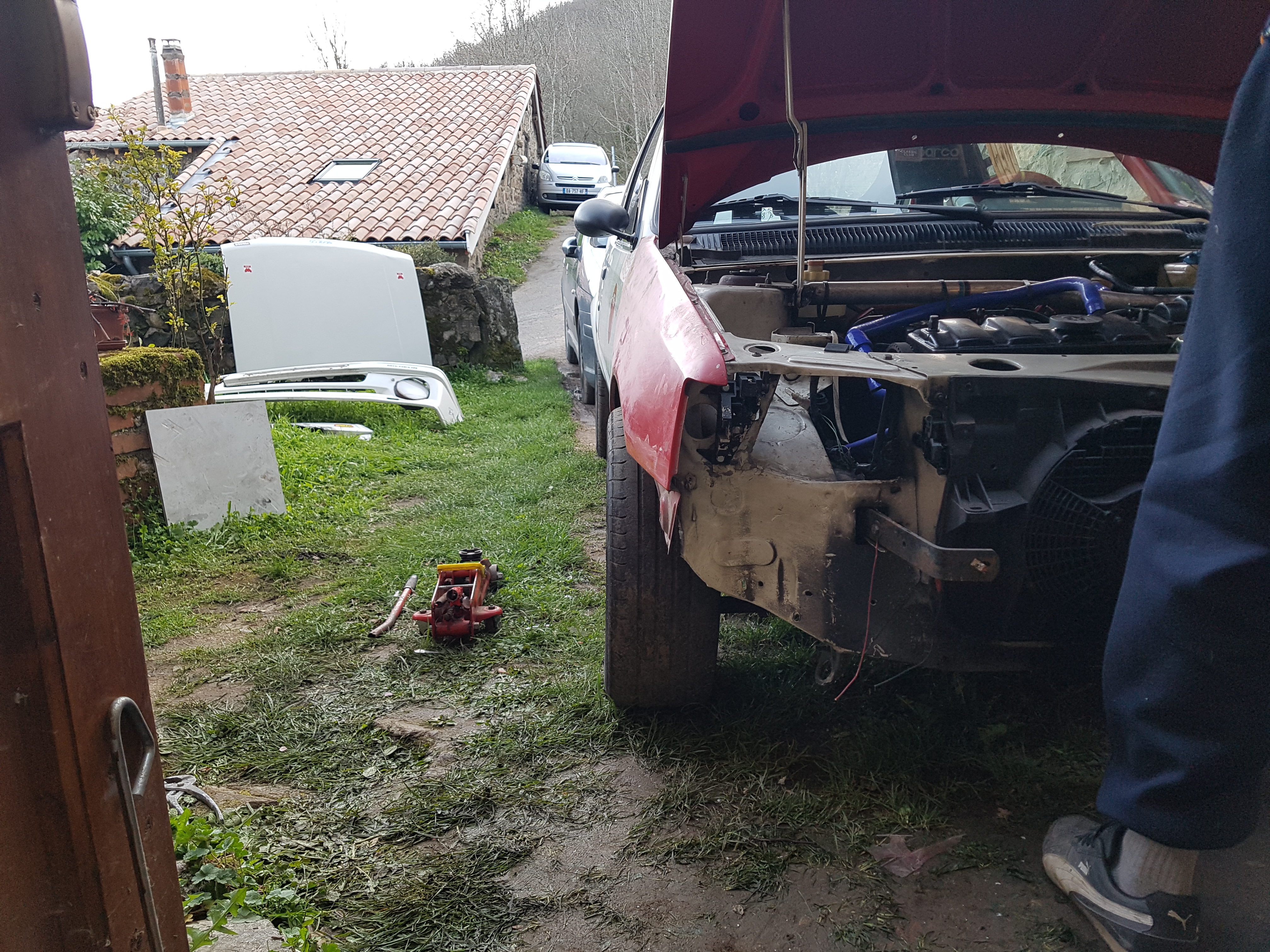 Quand à Alex, il posait les pièces qu'il avait chez lui, devant le portail de Stef, samedi à la première heure pour qu'il puisse les monter chez moi dimanche avec Gousk. Jeannot qui m'accueille le dimanche matin aussi pour me filer un capot, alors qu'il était peinard chez lui en amoureux avec sa femme...