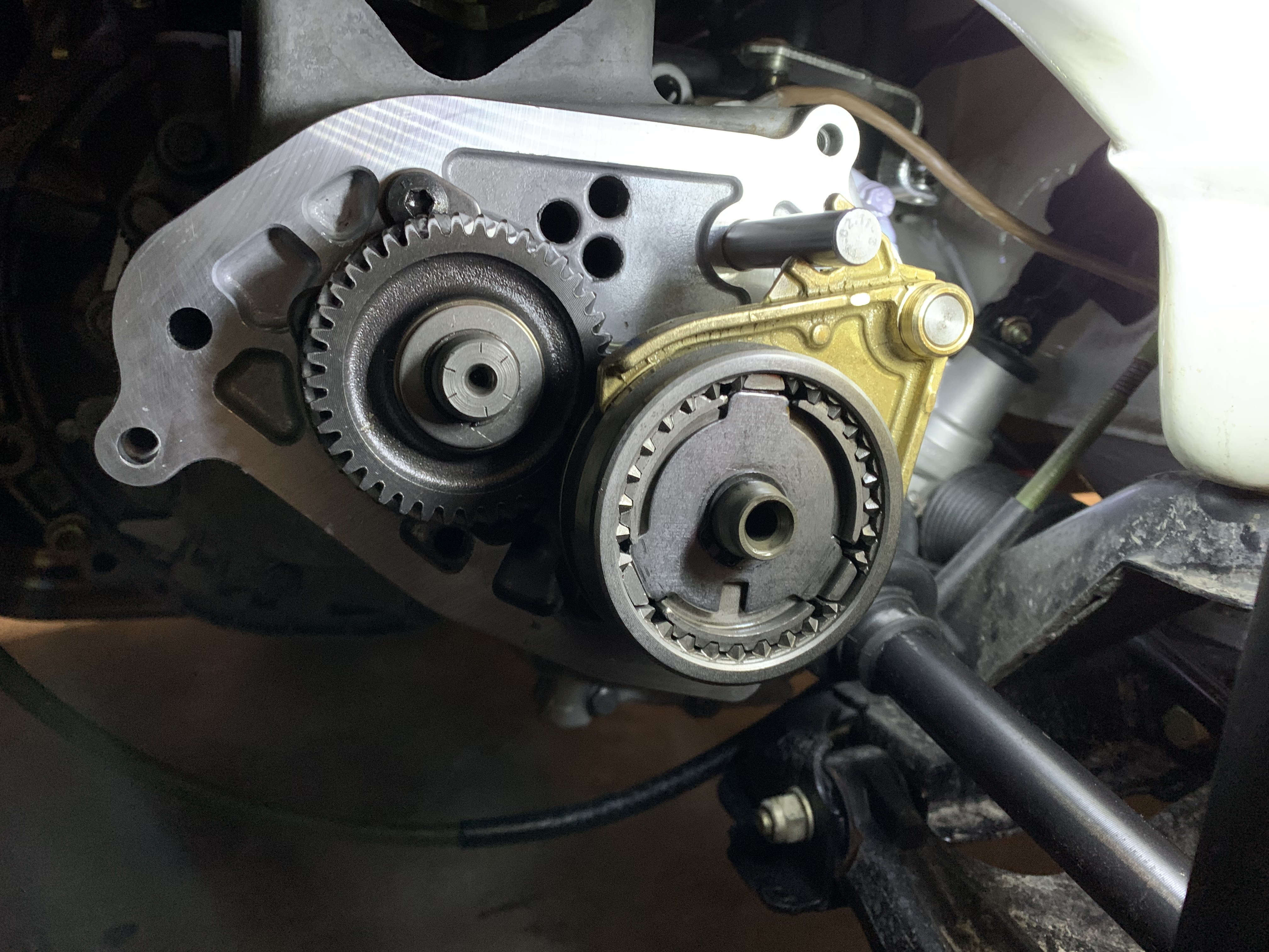 Là, ce qui est chiant, c’est qu’il faut panacher entre de là pièces ancienne et nouvelle. On est sur les mêmes diamètres d’arbres et les mêmes cannelures. Mais les épaisseurs de chaque pièces sont différentes entre les nouvelles et les anciennes.