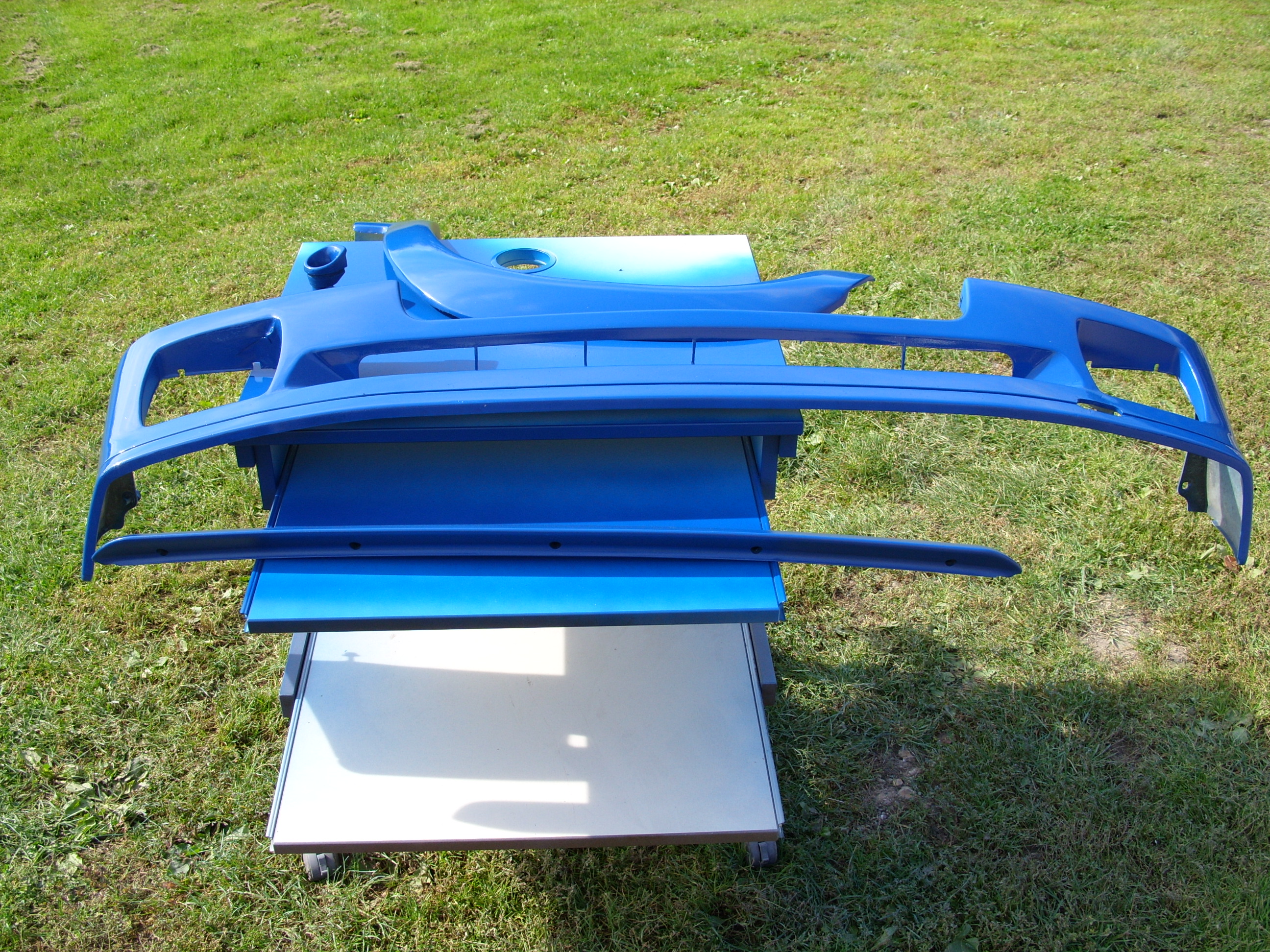 Donc j'ai peint les pares chocs et jupes, extensions, en bleu et les grilles en blanc, j'ai également pu assembler les pc et jupes, les roues avant, les ailes, les phares et plein de petit truc