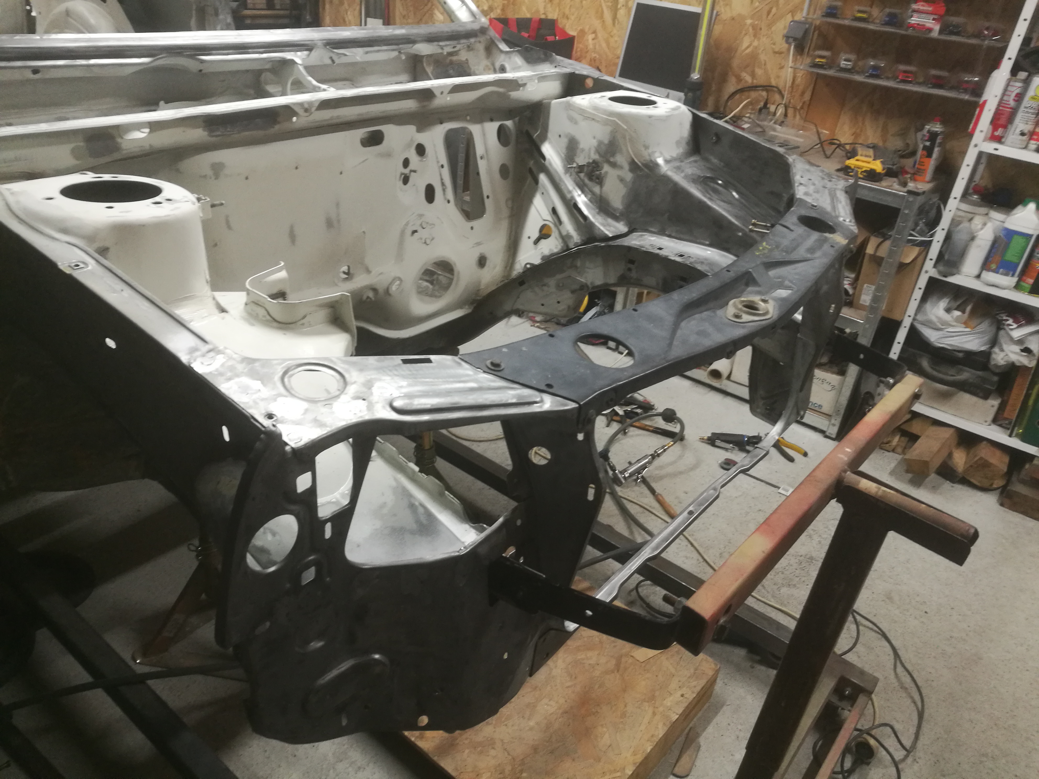La préparation de la baie moteur est terminée: soudure face avant, doublure d'aile avant gauche et bouchage de tous les trous "sauvages" + ponçage rapide.