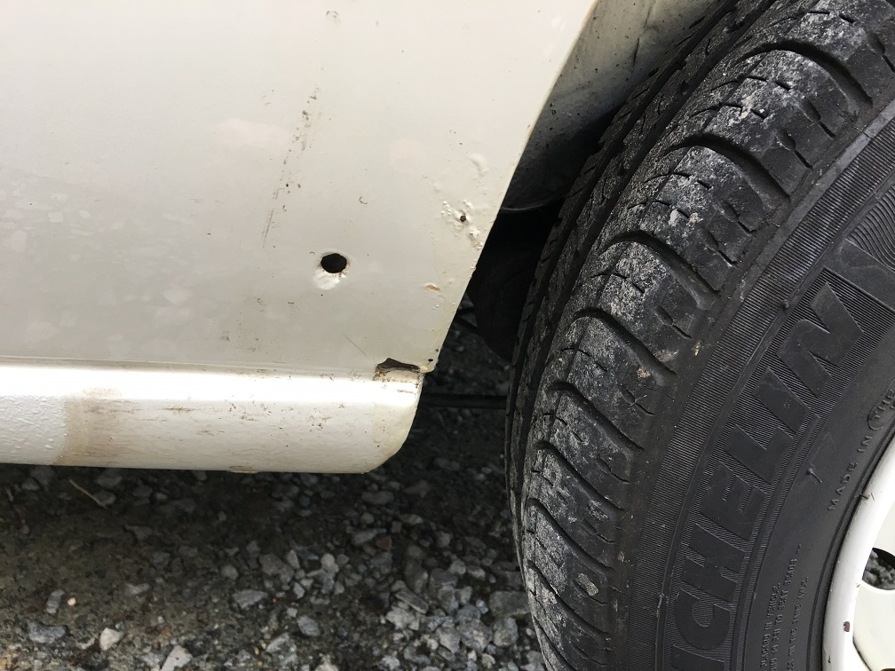 Début de piquage de rouille (notez le trou de fixation qui donne dans l'habitacle derrière le panneau de porte arrière, j'y reviendrai)