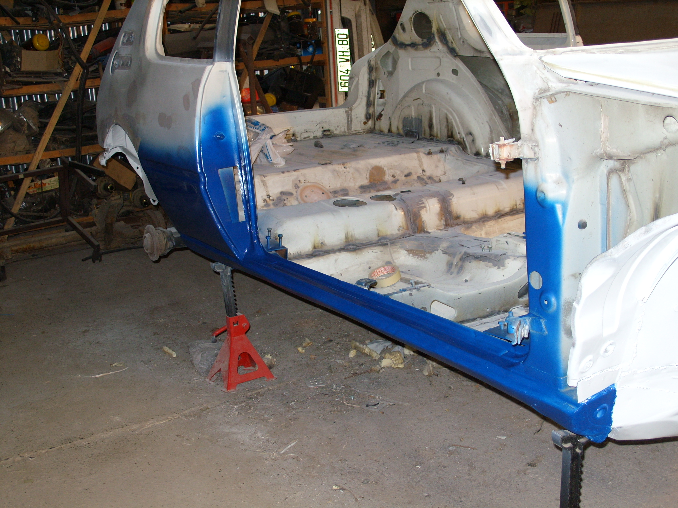 allez on continue, application du blanc a l'intérieur et dans le compartiment moteur, porte hayon et capot, ainsi que les photos du bleu