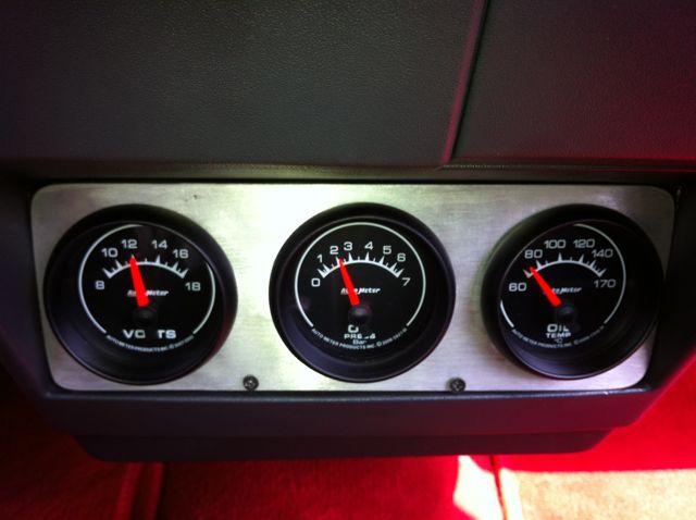 Enfin, une vue des manos montés a la place de l'autoradio. Ce sont des Autometer. PS: contrairement à une info publiée sur ce site, ils sont livrés avec les sondes. Au prix du dollar, c'est très interessant!