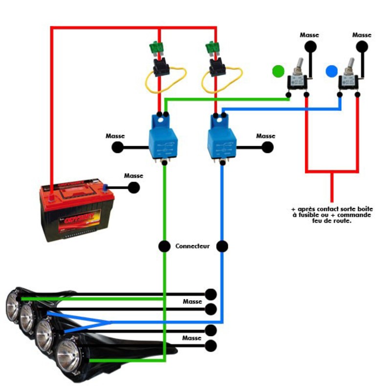 Pour le cablage, l'ideal reste de couples les interrupteurs au commodo "pleins phares"