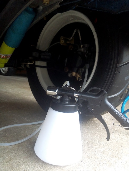 Je pose l'auto sur 4 chandelles, je dépose les roues, et je sors le purgeur que j'ai depuis des années mais que je n'ai jamais essayé