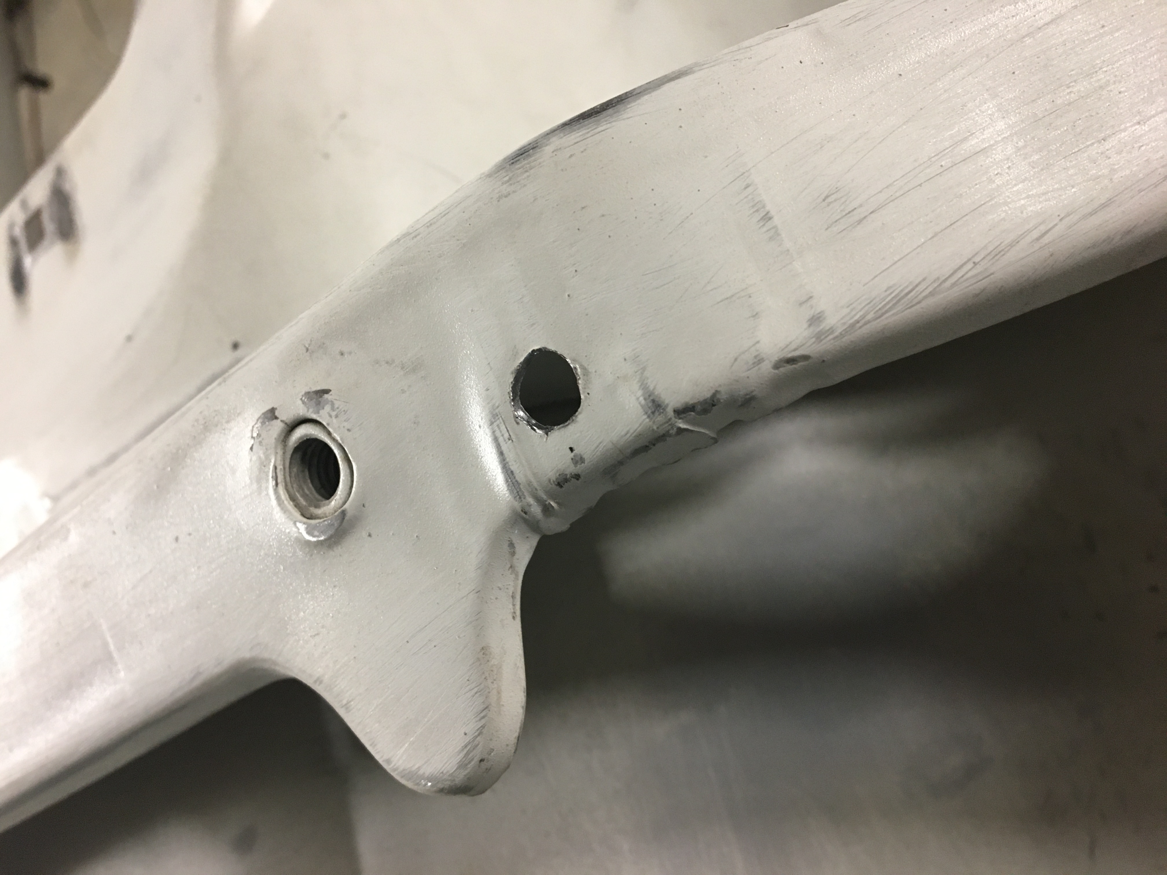 Un petit trou pour souder la patte. La patte en question En place ça donnera ça. Le morceau taraudé avec la patte soudée dessous. La préparation pour souder le tout. Deux petits trous de chaque côté du logement de l’insert d’origine. Une foi en place et le tout soudé sur la traverse.