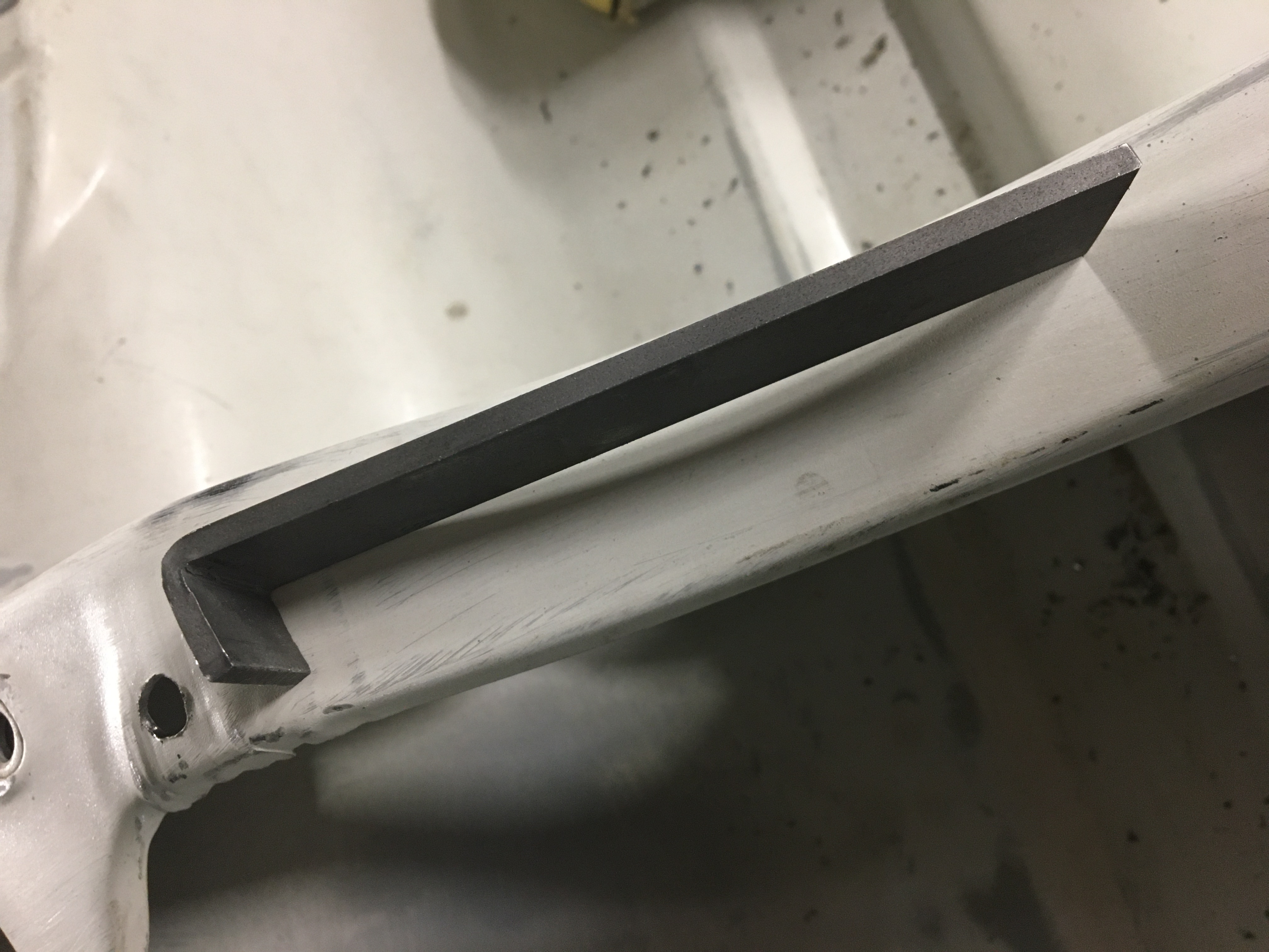 C’est pas du travail d’oie re, mais ça a fait le job. Une vue globale de la traverse avec les renforts soudés et apprêtés. Le dessous de la banquette bien brossé.