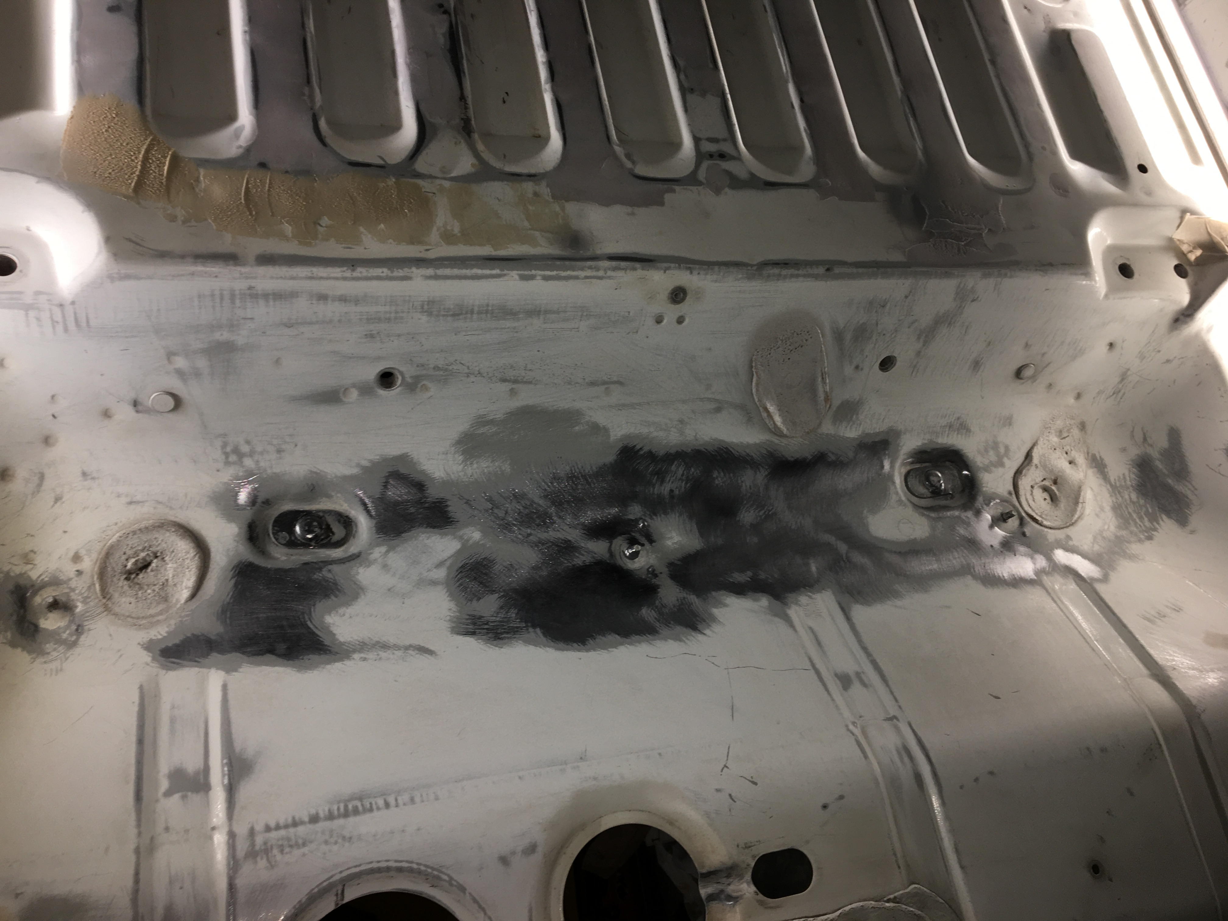 Sur mes photos, les parties grises sont celles où la tôle est à nue. Les noires son celles où il restait un léger film de rouille.