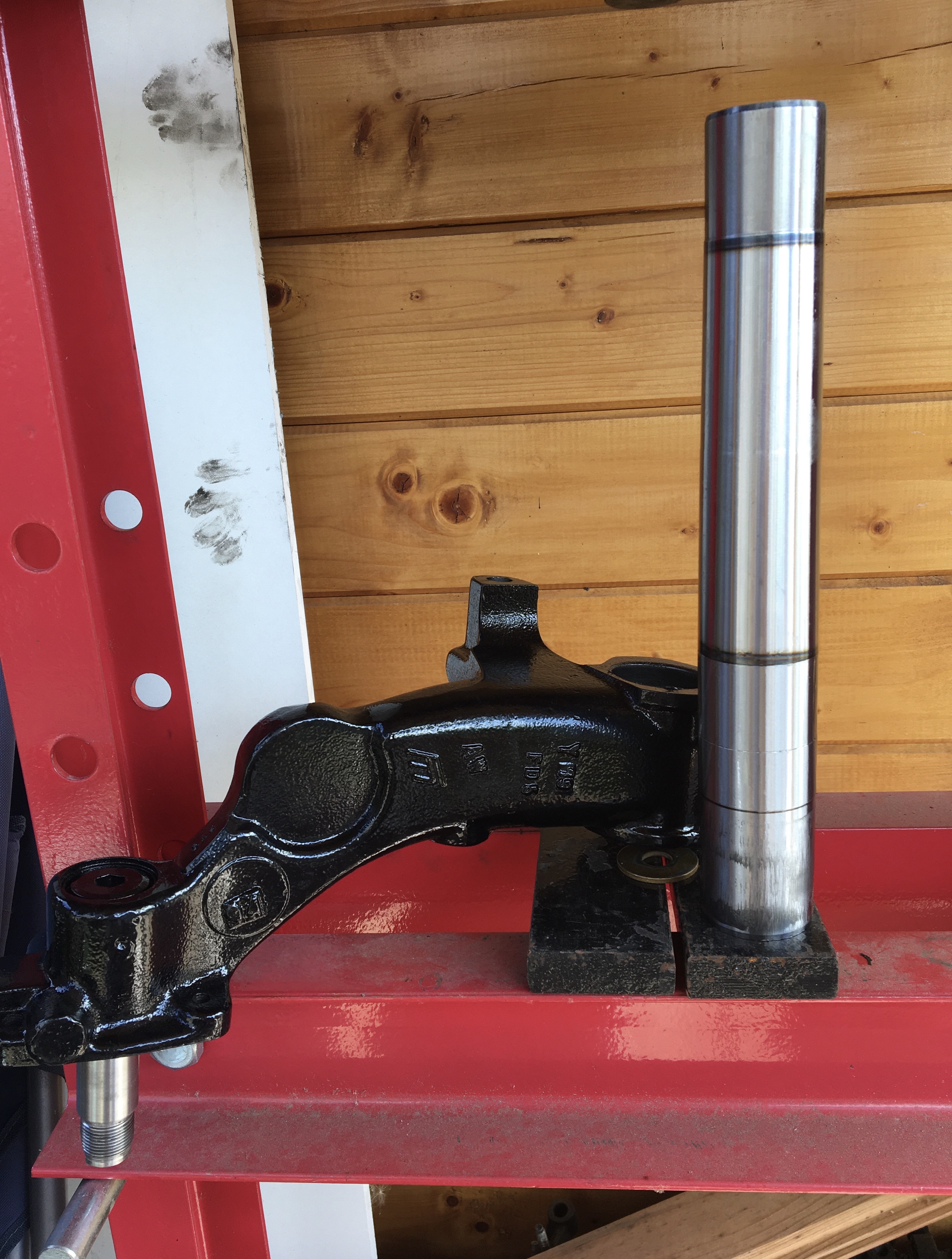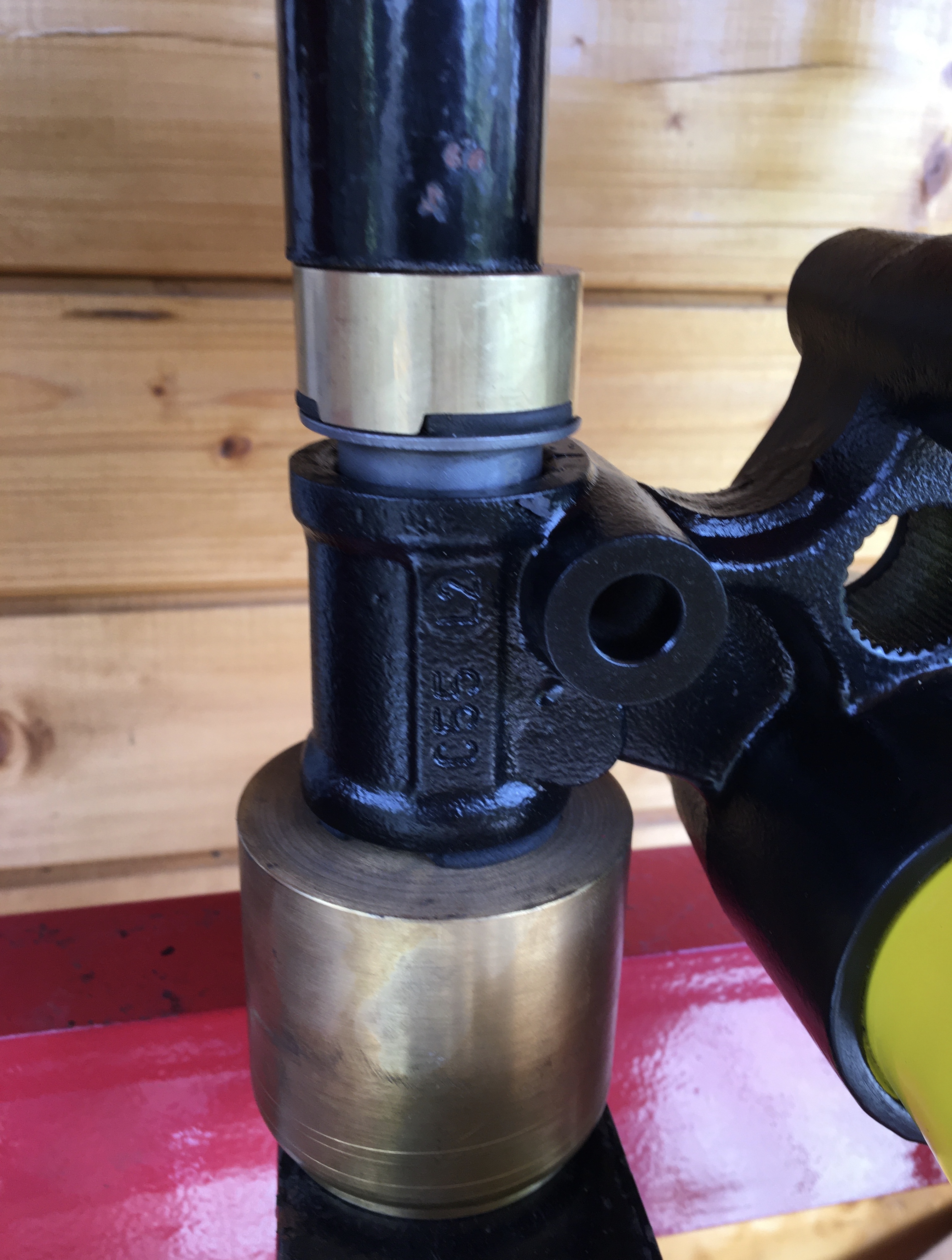 Je me sers de la poutre pour enfiler la collerette sur l’axe de bras. Puis la collerette qui reçoit le joint à lèvre Et enfin les Silentblocs de poutre. Restera à assembler le tout.