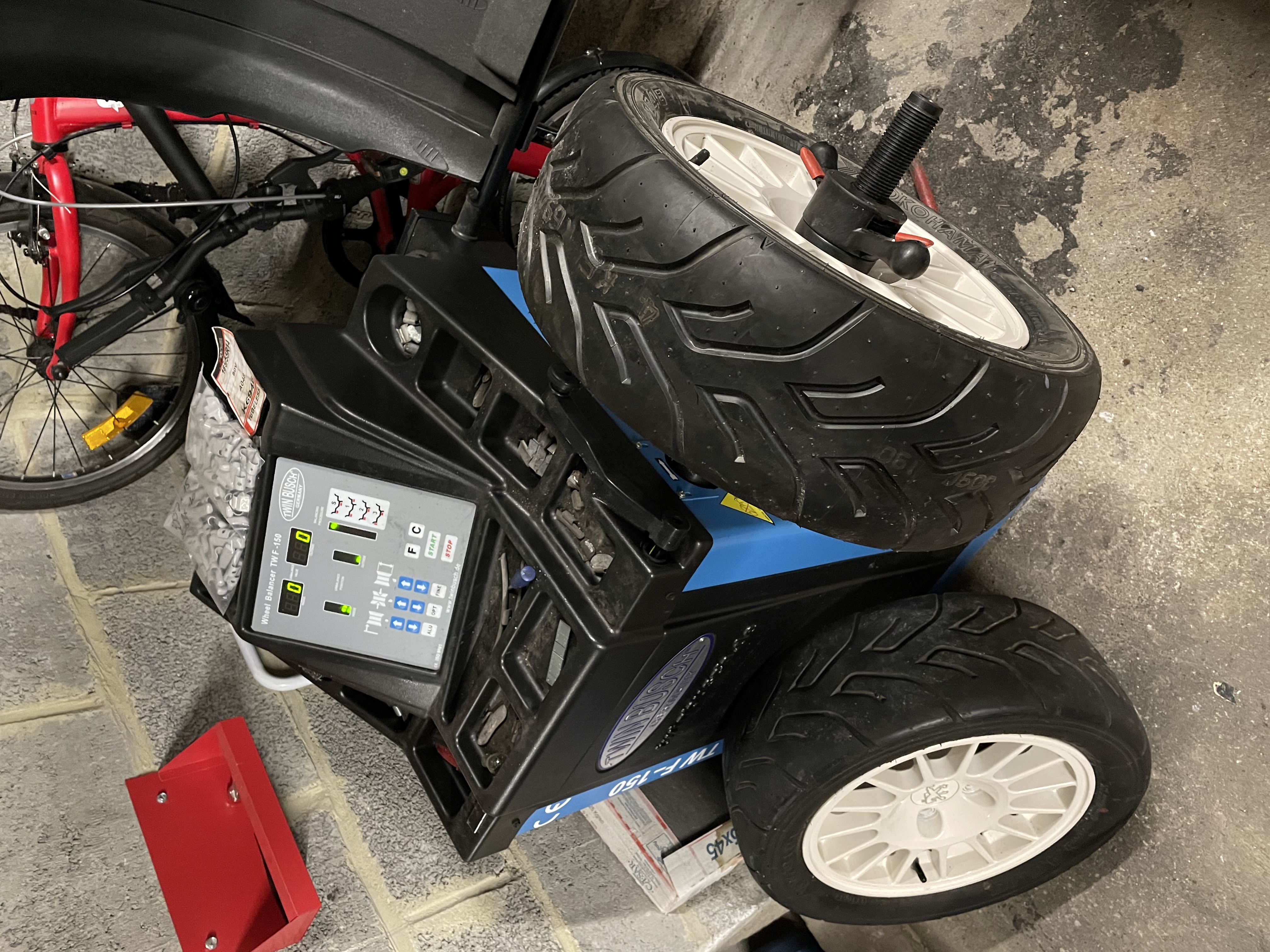 Et voilà petit boulot du dimanche matin, réparation d’une crevaison sur la roue arrière droite (un clou est venu de loger dans le pneu, une petite cheville Tiptop) et montage/équilibrage des pneus avant sur les groupe A :ok: et le tout est remonté sur la N2 ! En fin d’aprem petite séance de roulage :ok: