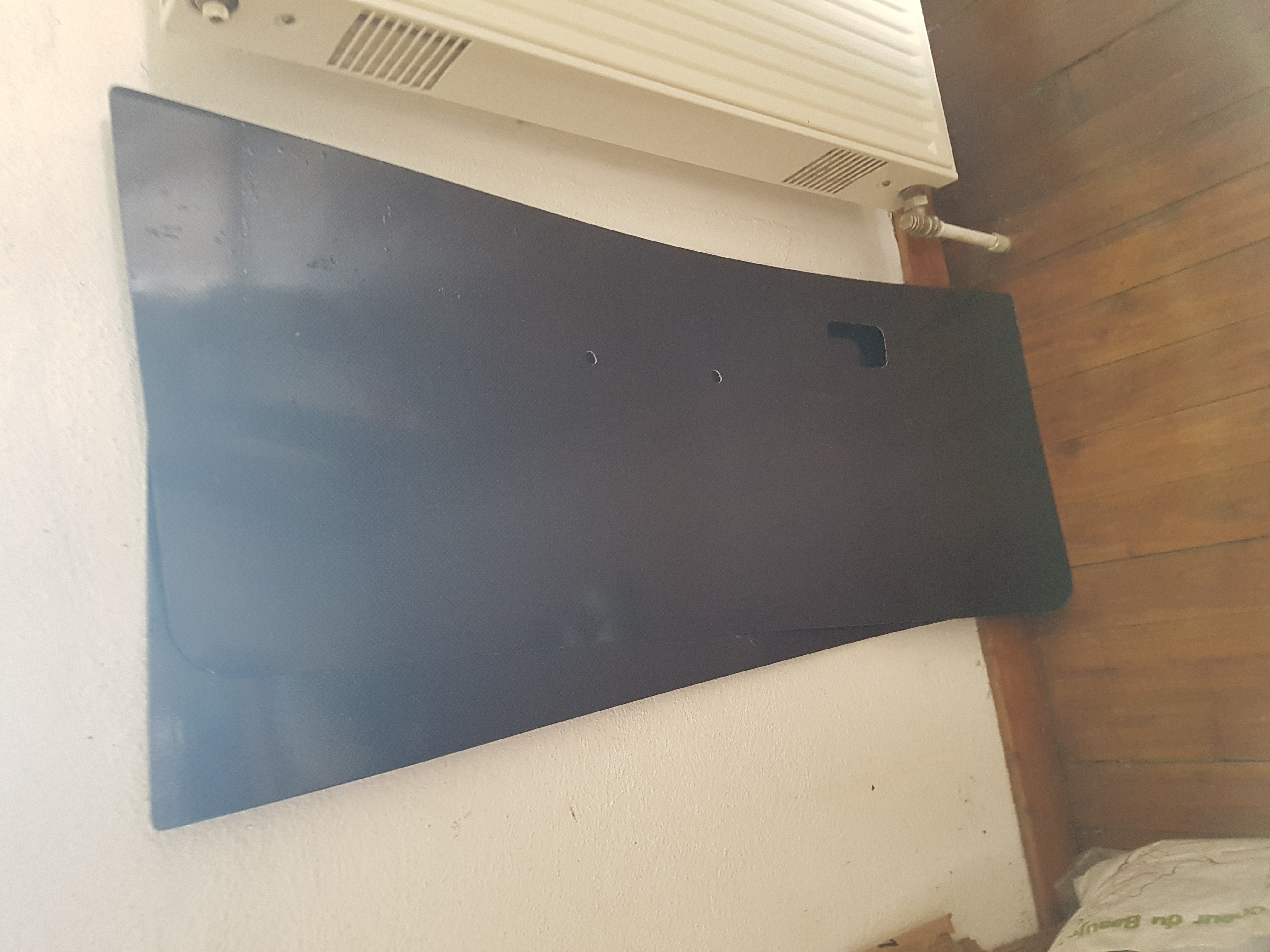 Les panneaux de portes en fibres on été recouverts de film par Stef et finissent de tendre à côté du radiateur