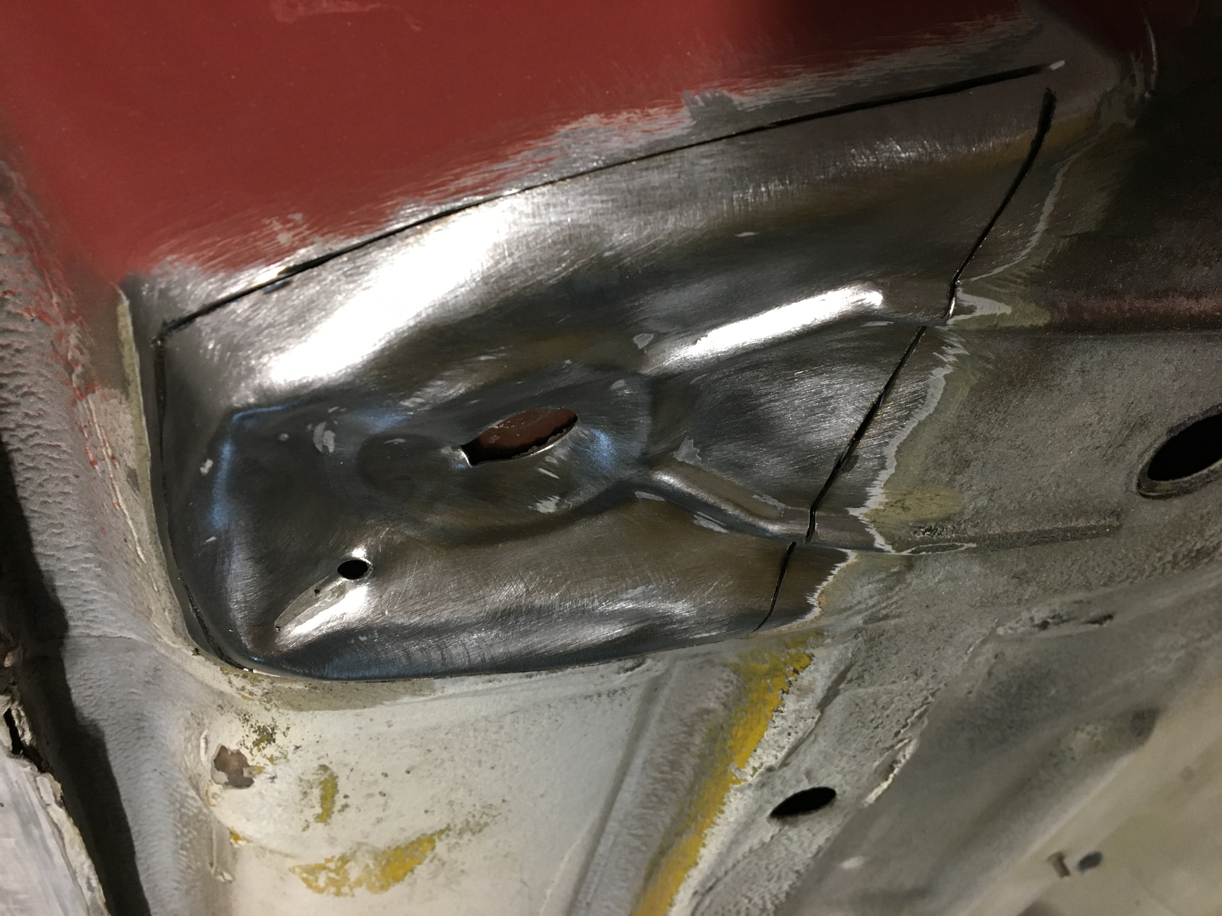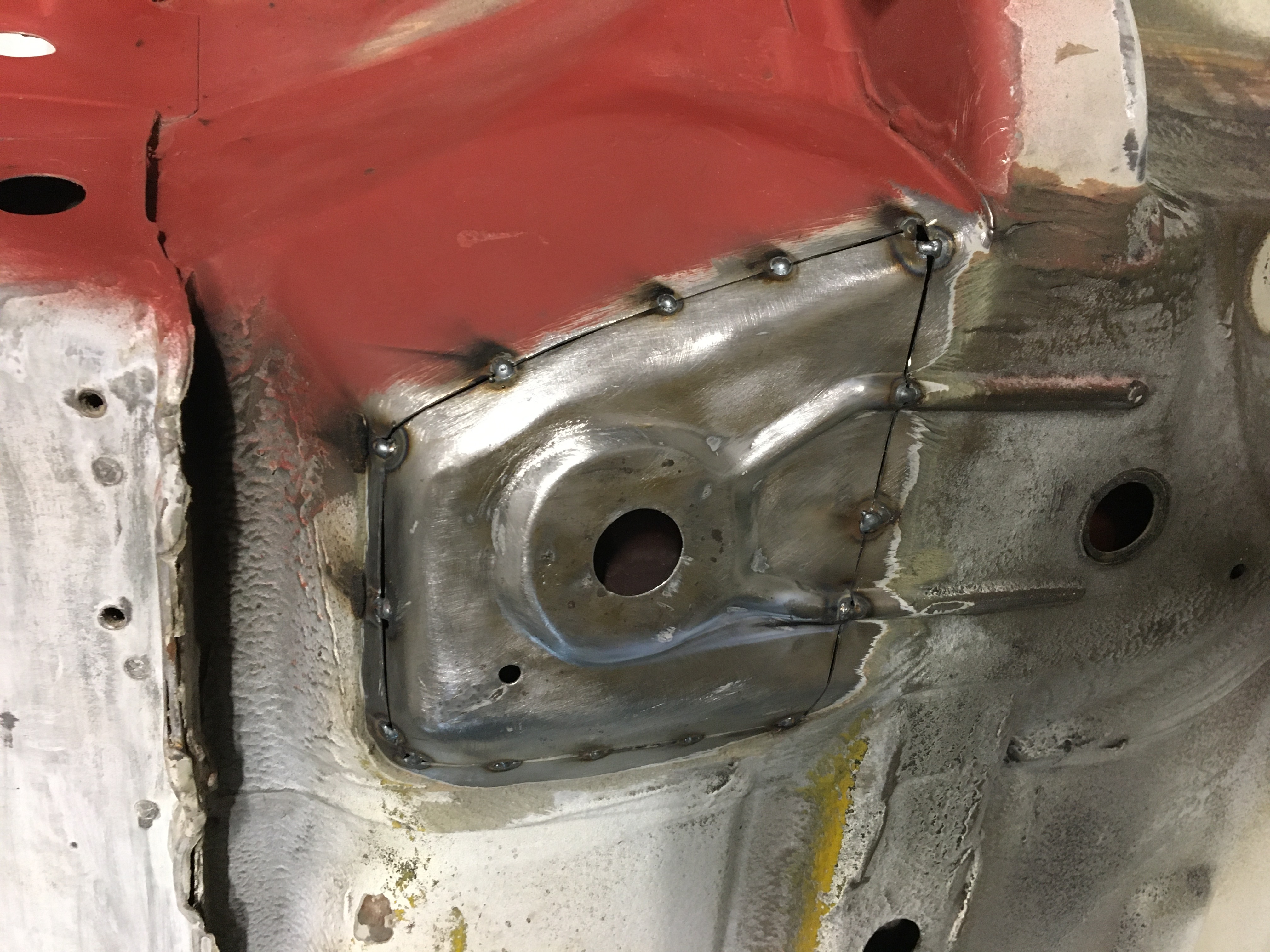 C’est pas du travail d’oie re, mais ça a fait le job. Une vue globale de la traverse avec les renforts soudés et apprêtés. Le dessous de la banquette bien brossé.