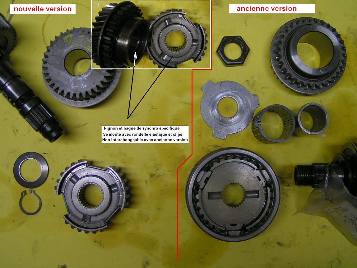 toutes les piéces représentées sur ta photo je les ai mais qu'est-ce que tu mets entre le gros roulement qui tient tout l'empilage de pignons à savoir (1ére,2éme,m.arriére,3éme,4éme)et le pignon de 5éme,car si je mets la meme rondelle que sur l'ancienne version elle nage vraiment autour de l'arbre et si je ne la mets pas le gros circlips plat autour du pignon vient se poser sur le pignon de l'arbre primaire avant que le pignon vienne en contact avec le roulement.