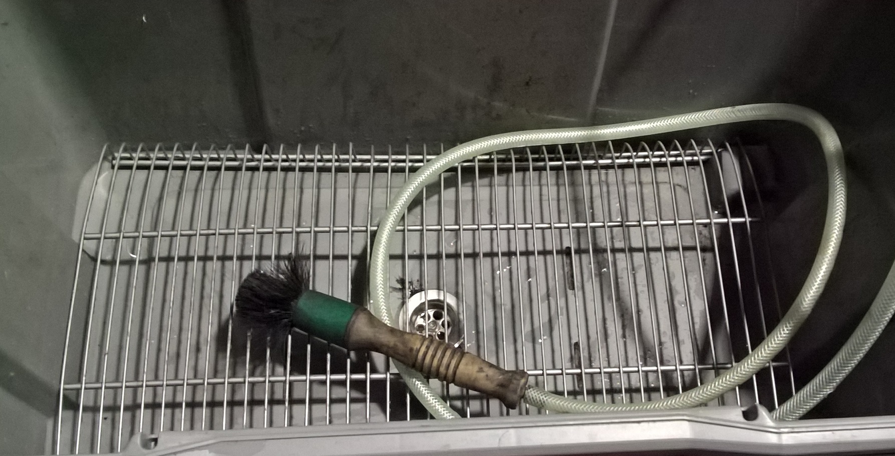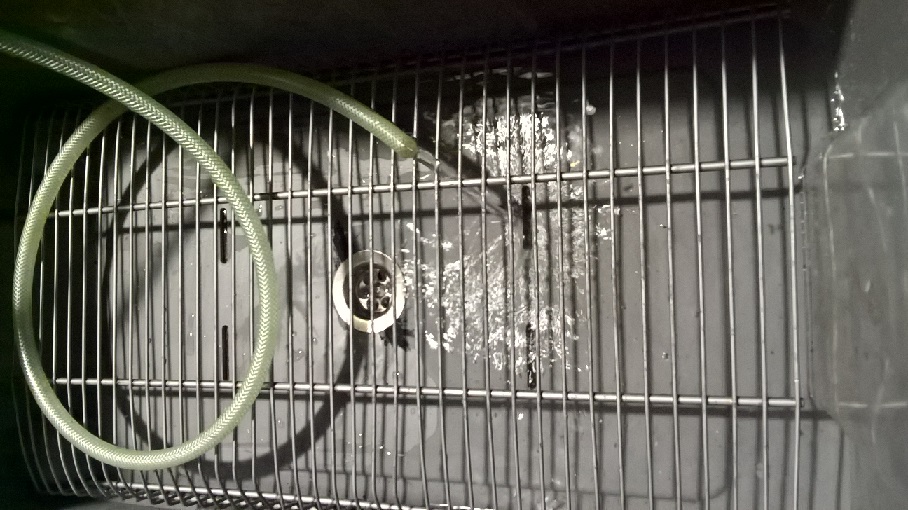 Le produit est collecté dans le bac de nettoyage (bricodep) de grande taille (copyright Bob). Au fond, une grille (caddy) ainsi qu'une boite inox perforée (cendrier Mc Do - pas sur la photo).