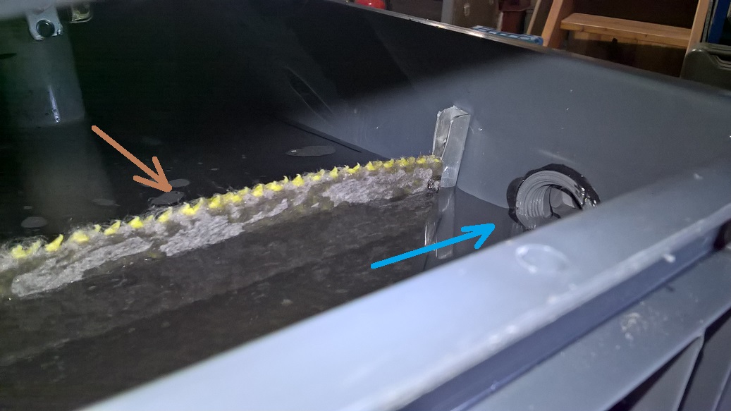 _ une plaque sur laquelle j'ai collé des aimants juste en dessous du tube de descente : elle attire les particules métalliques. La plaque est amovible, les particules tomberont toutes seules lors de la maintenance.
