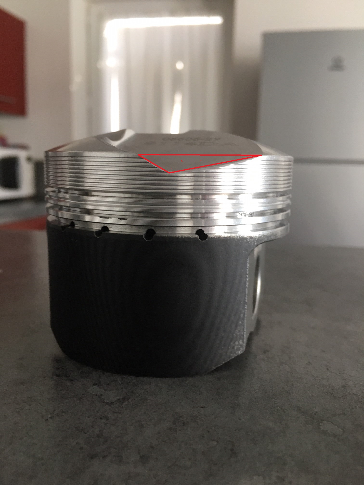 et actuellement je suis sur le moteur , et l'hors de mes calculs pour faire le RV je me suis aperçu que la valeur du dôme annoncer de 7.16 ( piston Wosser gros dôme ) ne coller pas , bref après plusieurs calculs je me suis aperçus qu'il avais un erreur ou un oublie ..., en effet la valeur donner par le fabriquant ne prenez pas en compte le volume des empruntes de soupapes négatives c'ait a dire l'emprunte des soupapes qui descend sous la ligne principale du piston et du coût cette valeur ( 3.20 cm3 ) pose problème car pour le calcule final du RV cela change énormément le volume de chambre de combustion .