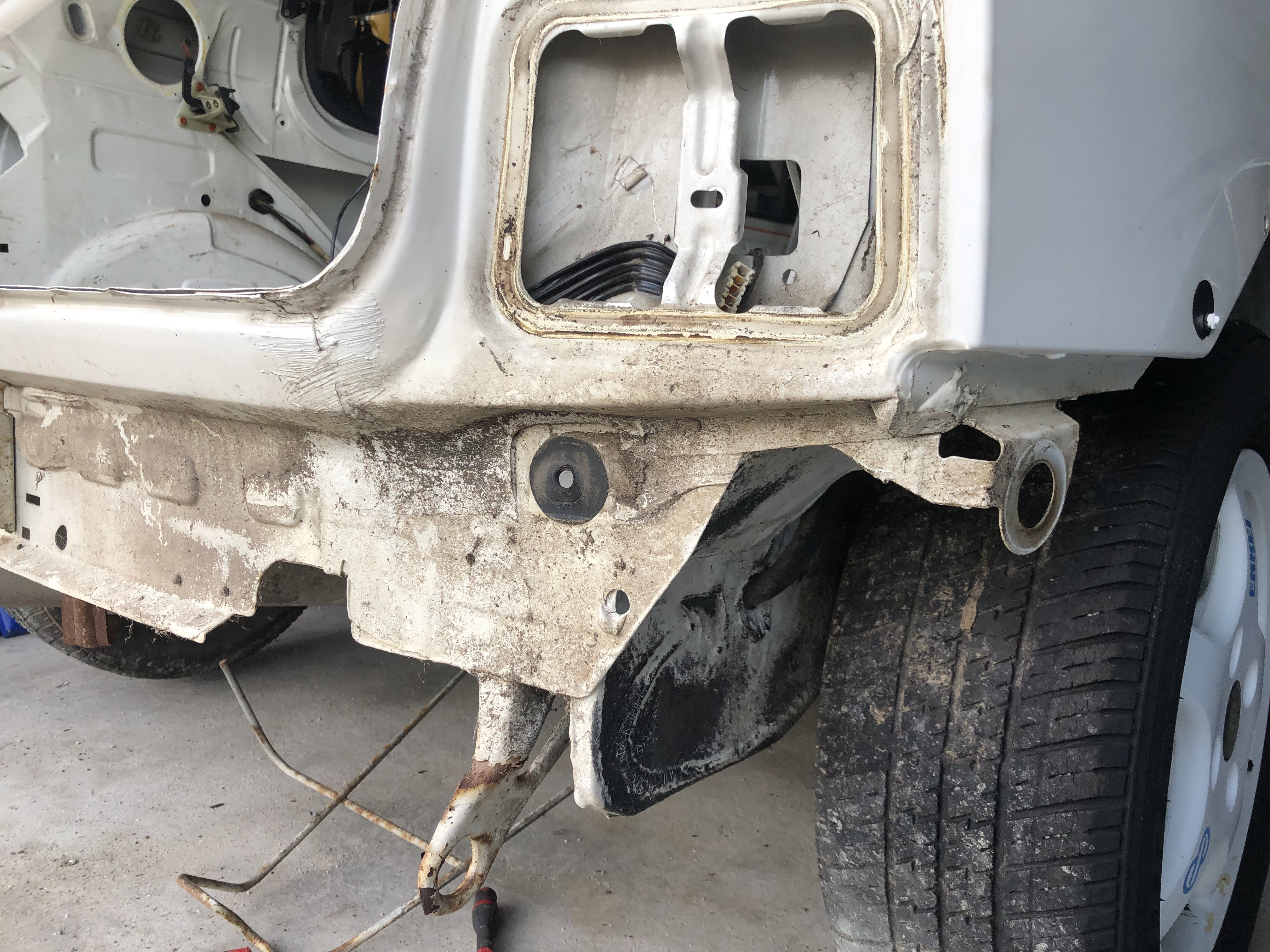 Bon les jantes ce sont des speedline enkei en 5 1/2x 13 il y en as 6 ( qui d’ailleurs sont à vendre elles plaisent pas à madame) , le boulot de démontage à bien attaqué avec quelques surprises sur le plancher <_< ( points de rouille 4 trous à boucher, fissure fixation siège conducteur) mais dans l’ensemble elle est assez saine.