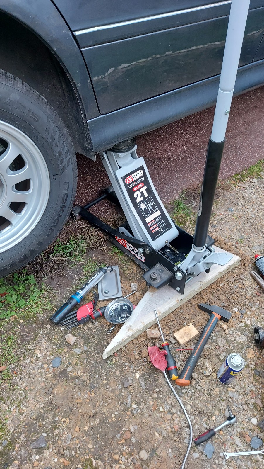 Mes 2 crics "à 30e" type norauto ne levaient plus assez haut pour choper un point solide sous le train arriere. Ba ouais, à force de manipuler mon cric il était haut.....