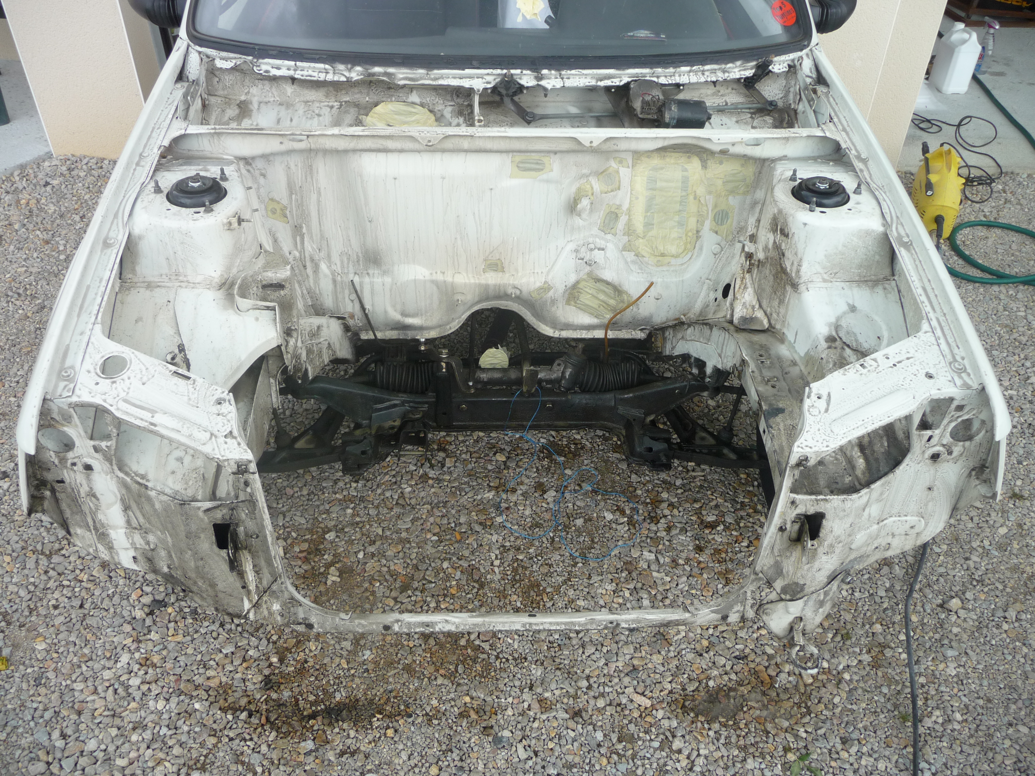 au programme: nettoyage du compartiment au karcher eau chaude, dégraissage, ponçage, traitement de la tôle oxydé, apprêt phosphatant, re ponçage, peinture et blaxonnage des passages de roues avant B)