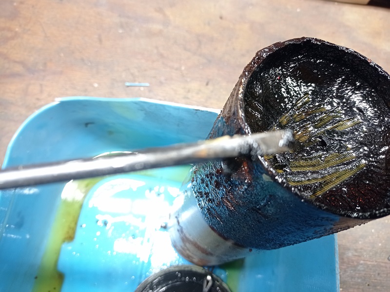 Finalement, ça se dissout à l'acétone. Gros avantage, c'est que l'odeur "gasoil / acétone" diffuse une senteur dans le garage... on se croirait dans un magasin de bougies parfumées, rien que du bonheur. :crying: