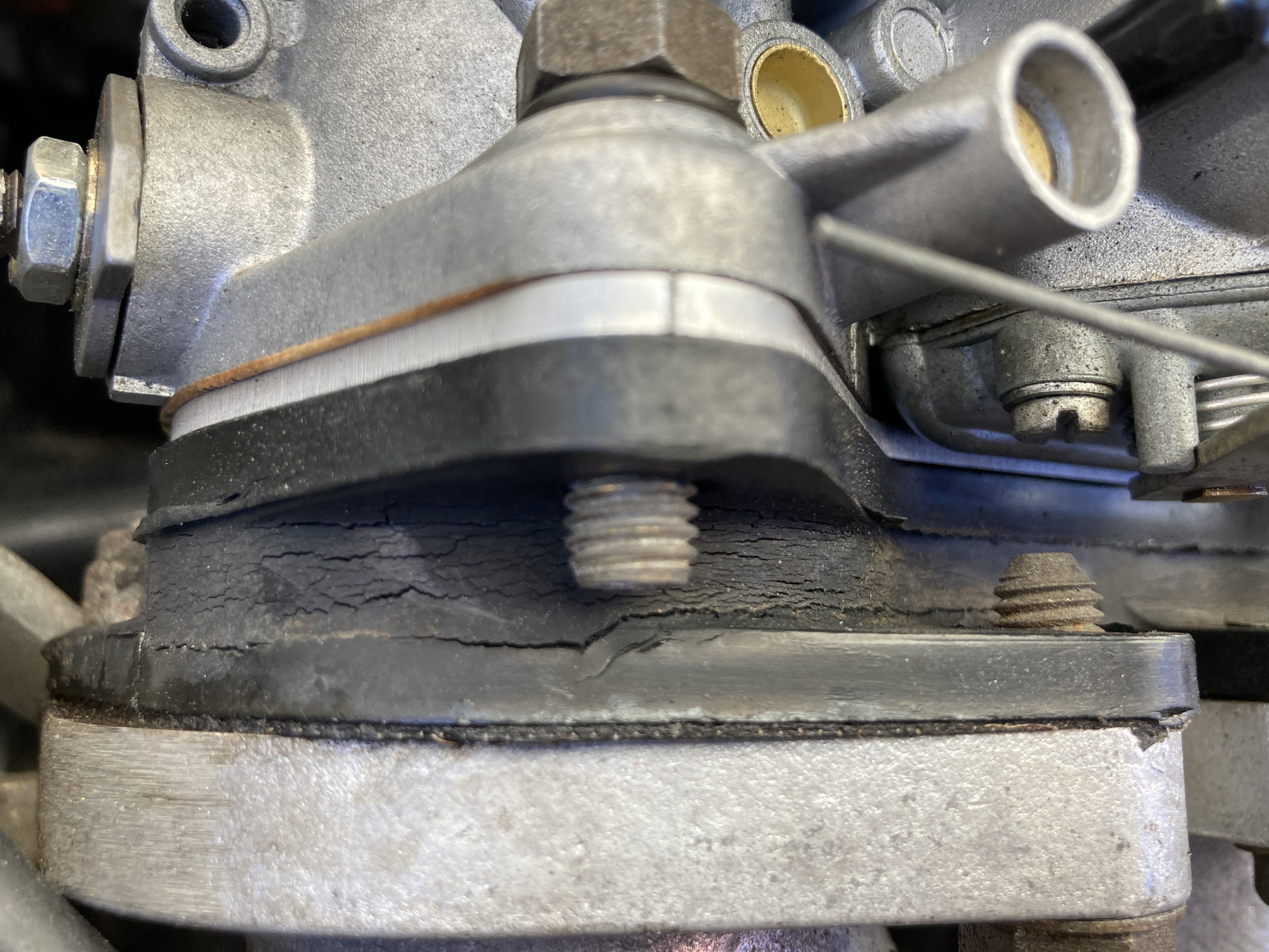 Since the rebuild the car is driving fantasic... Apart from one thing, a BIG VIBRATION. I though maybe it was the drive shaft, so I changed this part as the bearing was not smooth. No change with the vibration. Could it be the Webers? Perhaps my rubber mounting block needs replacing with these cracks?