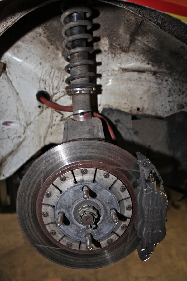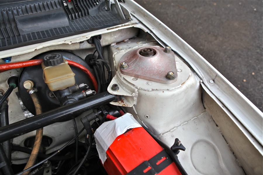 Tête d'amortisseurs et coupelles, sur ces vues on voit bien la modif, pour passage de coupelles à 4 vis utilisées fin 1990 lorsque la voiture a roulé aux Cévennes et à l'Antibes aux coupelles type 309 16s à 3 vis pour 1991