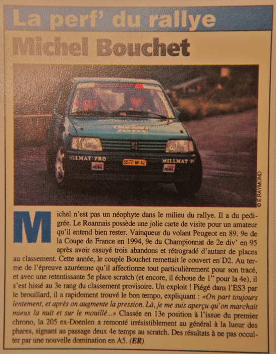 Tous les fans de Rallye de Rhône Alpes l'ont bien connue quand Michel Bouchet la conduisait avec Madame entre 1994 et 1996, réalisant des exploits. Je l'ai vue la première fois au Rallye du Gier 1995 lorsque Michel se battait avec les 4x4 GRA ... pour une 5ème place Scratch si je me souviens bien !
