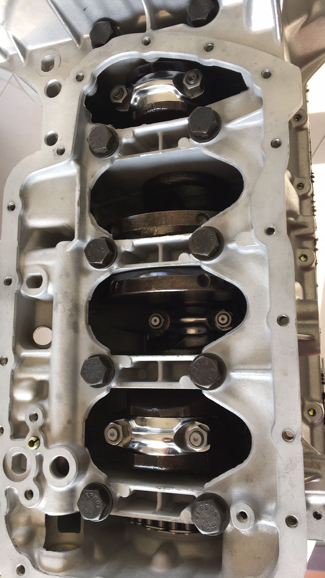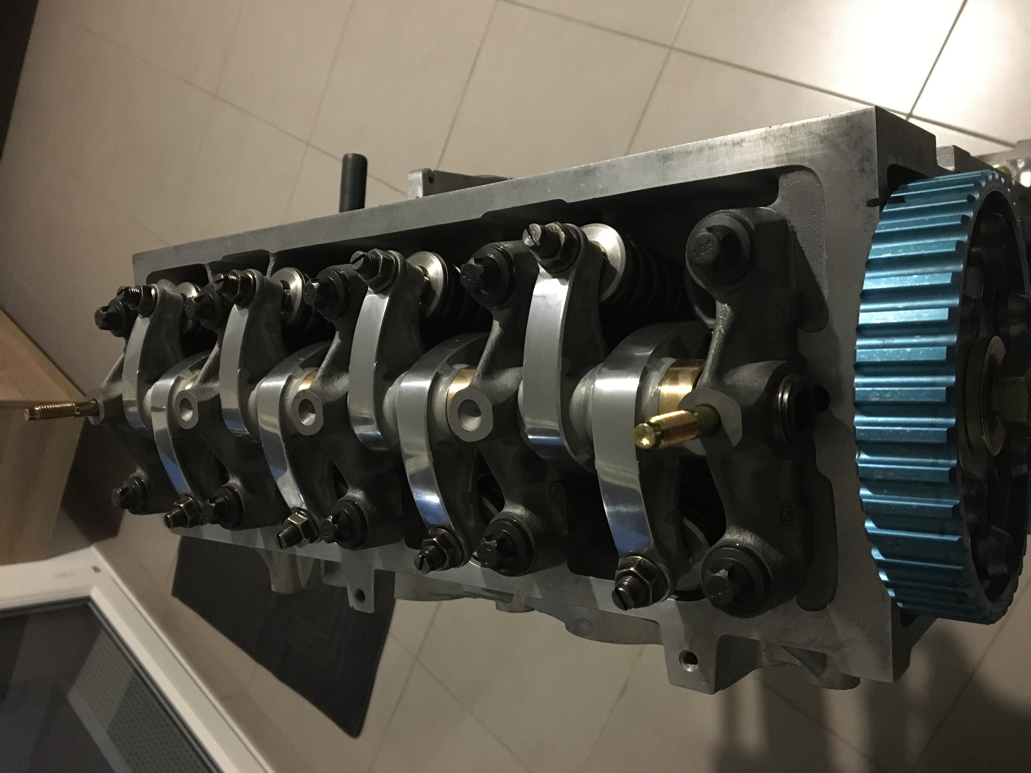 Chemises montées et chapeaux de bielles serrés. Mise en place de l’AAC Ensuite montage culbuteurs. Pas de repère de calage sur une poulie d’AAC Kent cam.