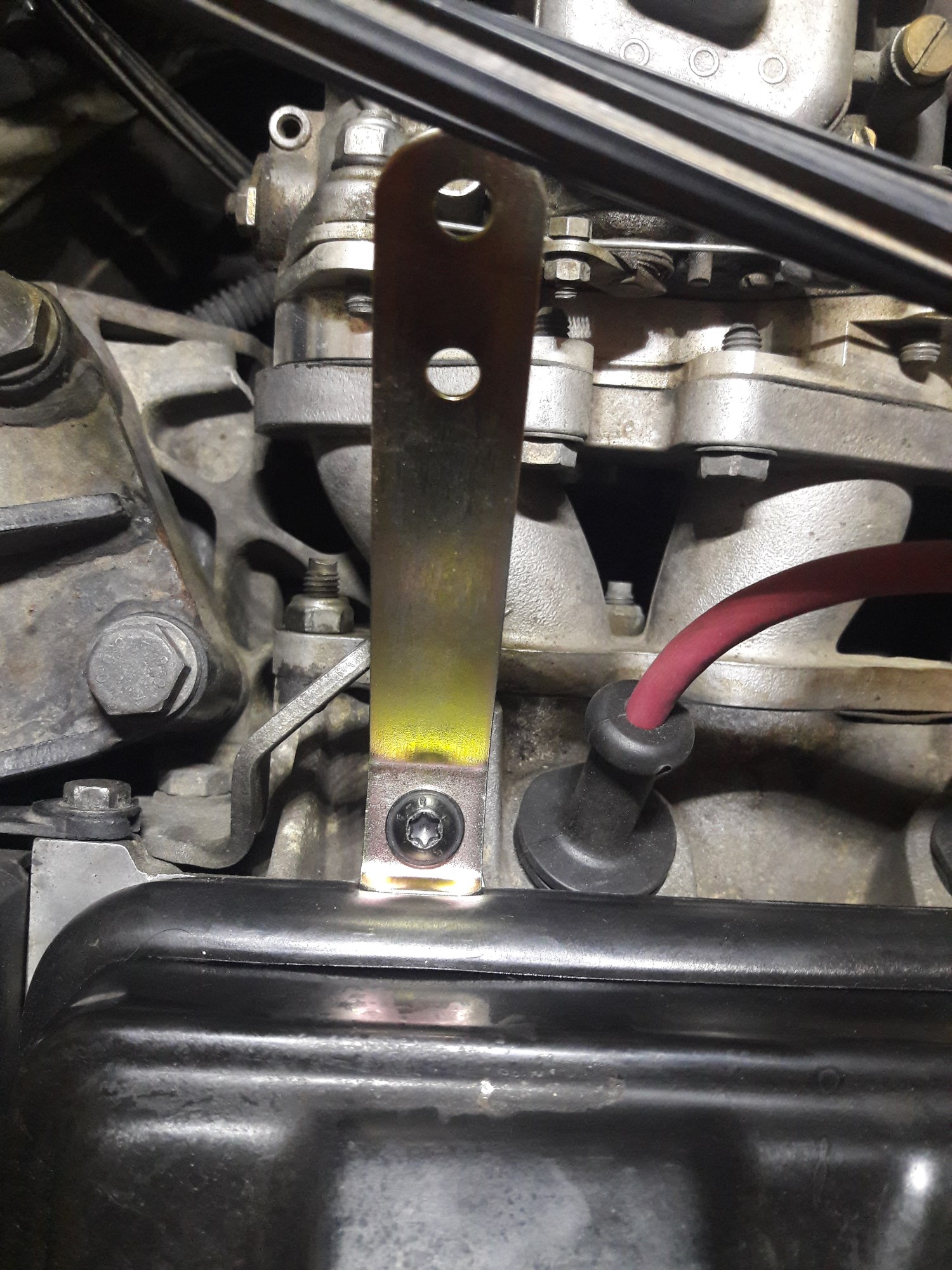 J'ai voulu aussi installé la papate de support de câble d'accélérateur. J'ai trouvé la bonne vis, mais il faut démonter le couvre culasse ! J'avais pas le couple de serrage en tête, donc je verrai ça plus tard quand j'aurai aussi le clip de maintient.