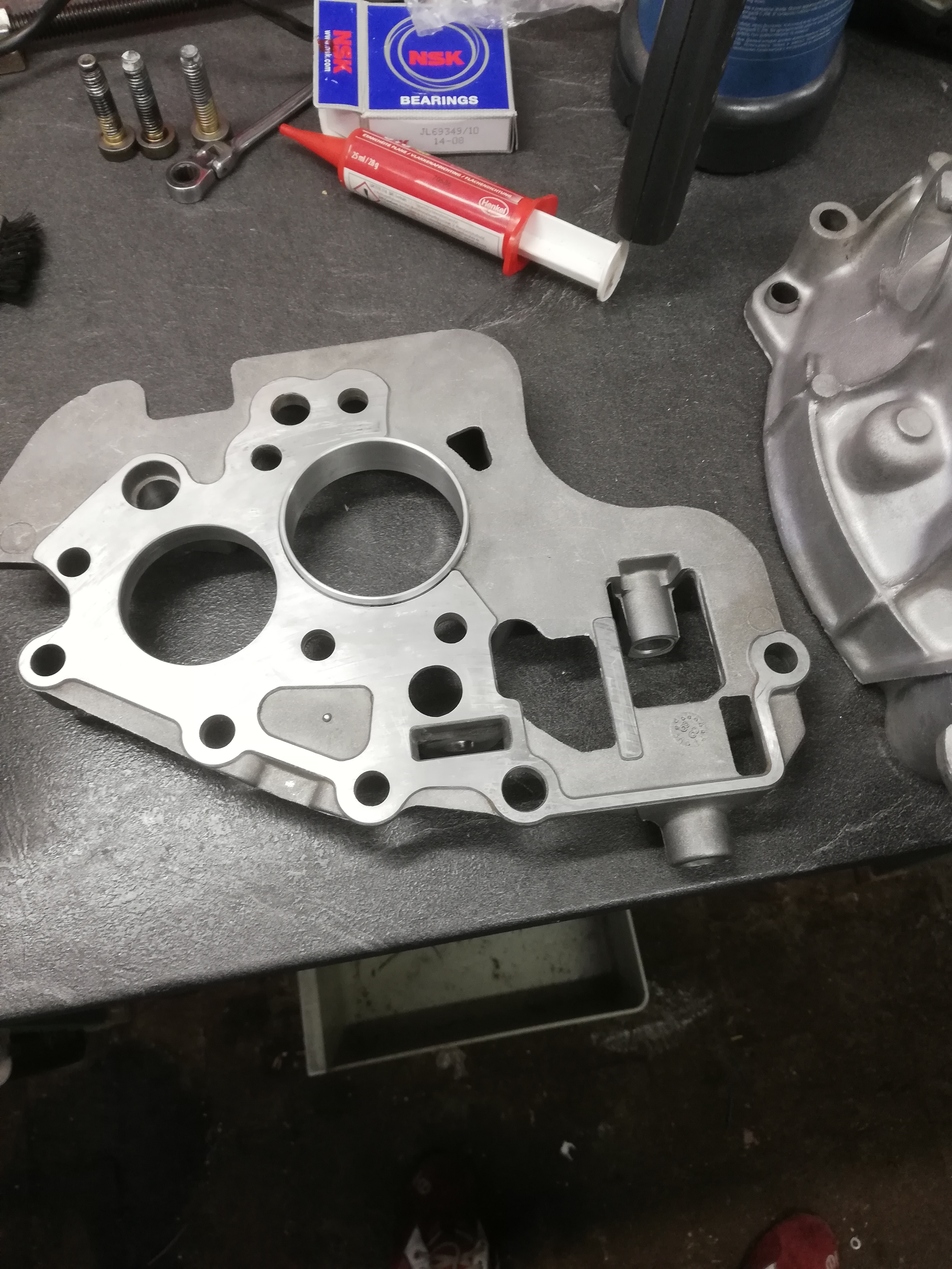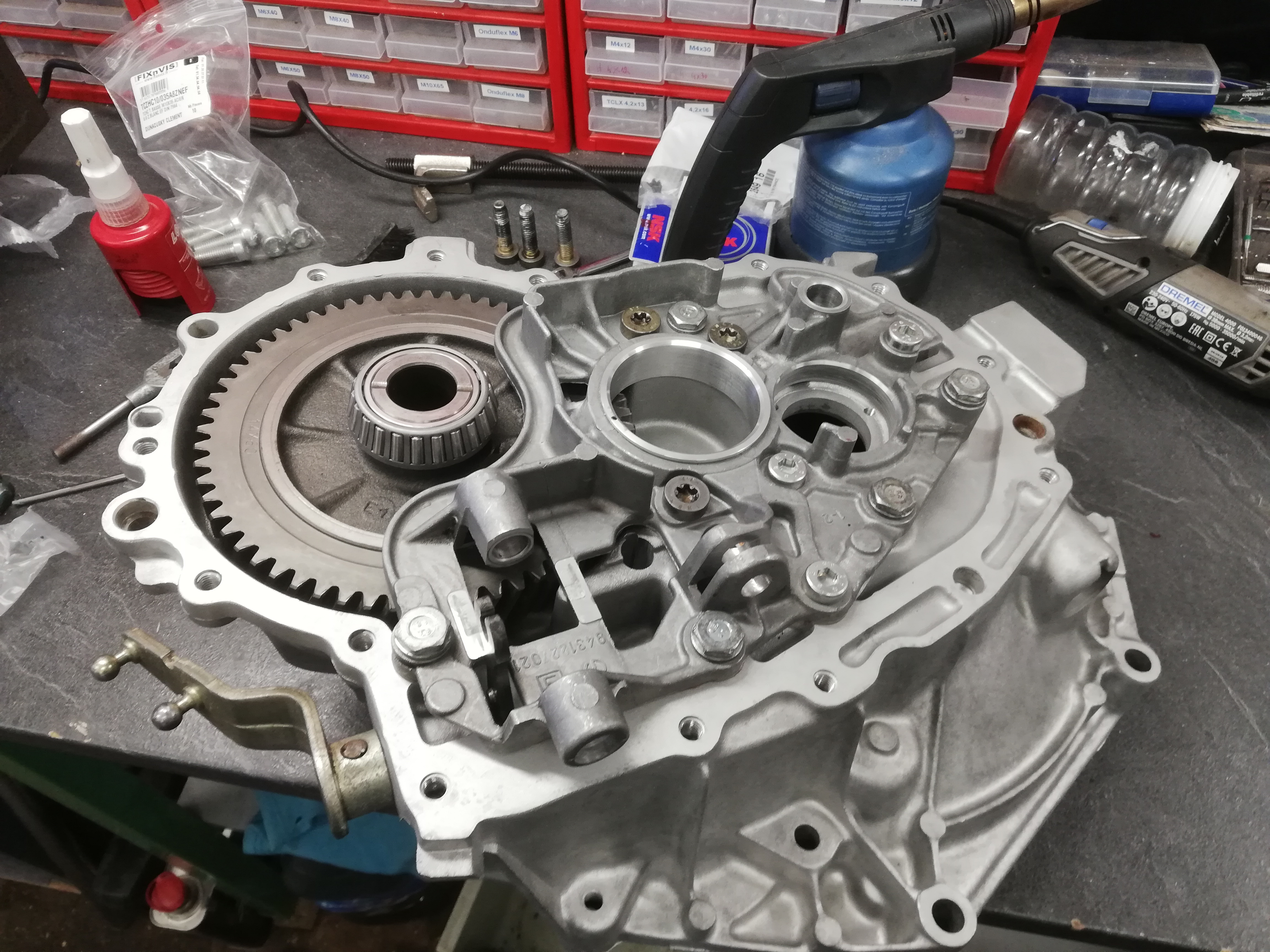 On met tout ça dedans, la plaque, les filets préalablement nettoyés avec des tarauds, dégraissés et soufflés. Les vis de plaques (3 neuves pour remplacer celles dont les têtes ont souffert au démontage) brossées, dégraissées et enduites de Loctite 270. On serre tout ça a 50Nm et on est prêt a assembler les arbres et les monter