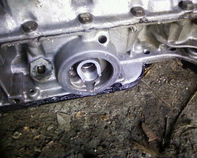 resultat aprés demontage la traverse inf ai venue toucherl e filtre a huile ce qui a forcé l ensemble modine et filtre vers le bas et ma cassé une partie du filetage qui se trouve sur le bloc :blink: