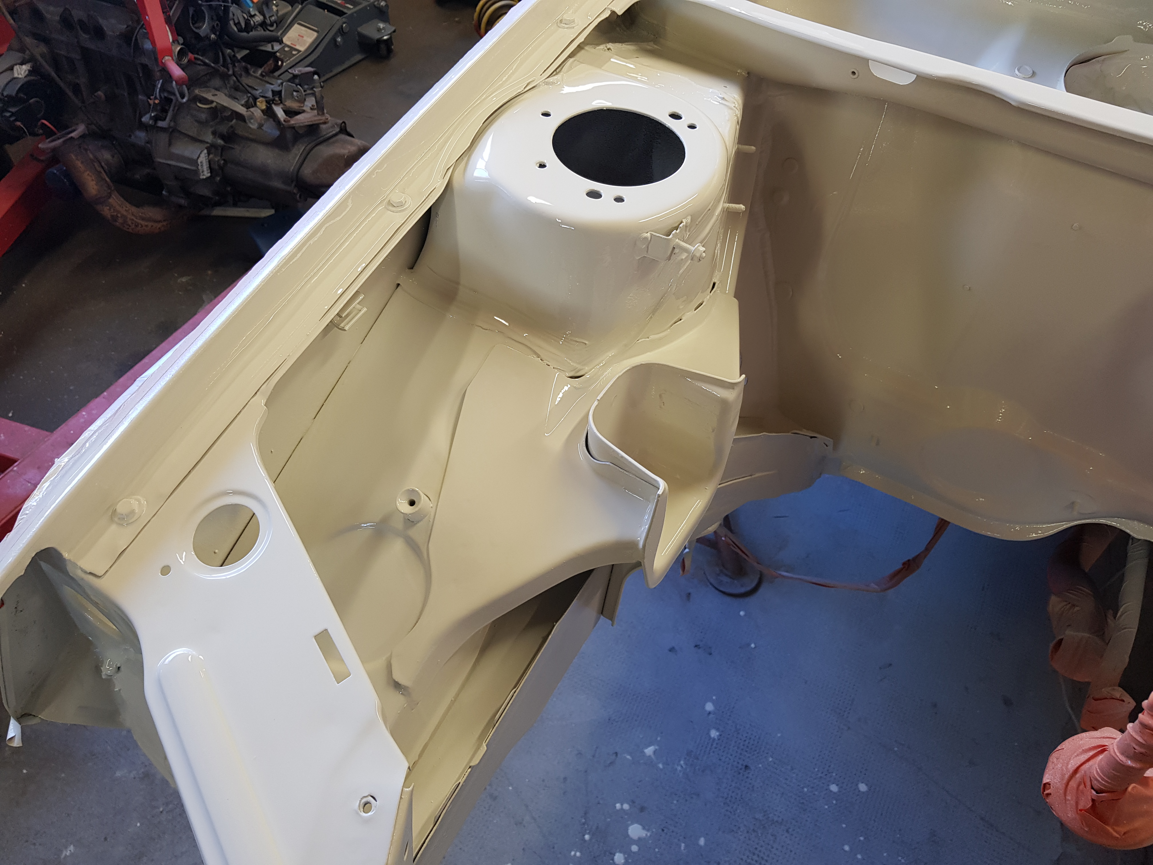 Fine couche de blacson avec durcisseur, appret blanc du compartiment moteur et passage de roues.