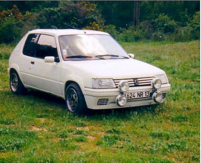 En faisant du tri chez moi, je suis retombé sur cette photo de 1989 de ma première 205 Rallye.Je l'avais acheté d'occasion à un personnel Peugeot, elle avait 6 mois et 4900 Kms et je l'avais payée 62000 F contre 72000F neuve.Elle était absolument nickel, le proprio avait même laissé tout les plastiques de protection d'origine.