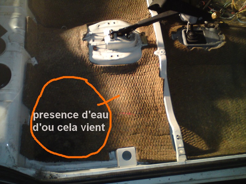 La flotte peut venir des joints de custode fuyard, des bouchons de plancher troués ou bien encore du radiateur de chauffage qui fuie... Voici les 3 sources d'eau que j'ai pu observé pour cet endroit.