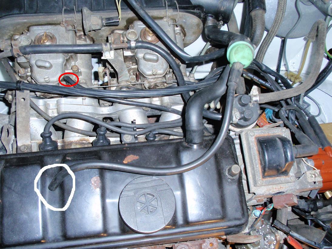 Car ce tuyau est censé être lié à la capsule, non pas directement car c'est le corps tout à droite avec sa prise sur le côté, mais par l'intermédiaire du by-pass (le truc drouge dans la culasse sous l'allumeur) si mes souvenirs sont bon. En gros ce système est la plupart du temps en rade avec les années et on le shunte purement et simplement.
