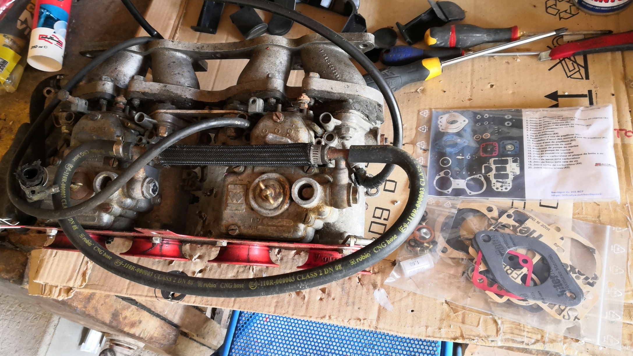Le moteur avec une partie des pièces et les carbus avec leurs pochettes de joints.