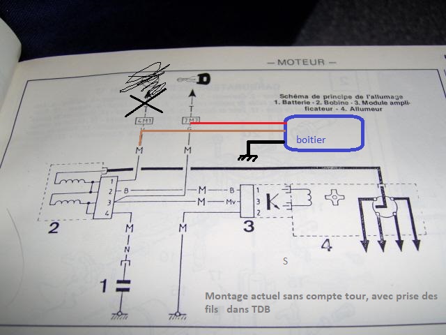 Du coup j'ai fais 2 schémas grossier, à partir de la page allumage du manuel utilisateur (j'aime bien cette page), un qui montre mon branchement actuel, et l'autre qui montre comment, à mon avis, devrait être raccordé le boitier dans les véhicules où le faisceaux est d'origine et où le(s) boitiers rupteurs sont capricieux.