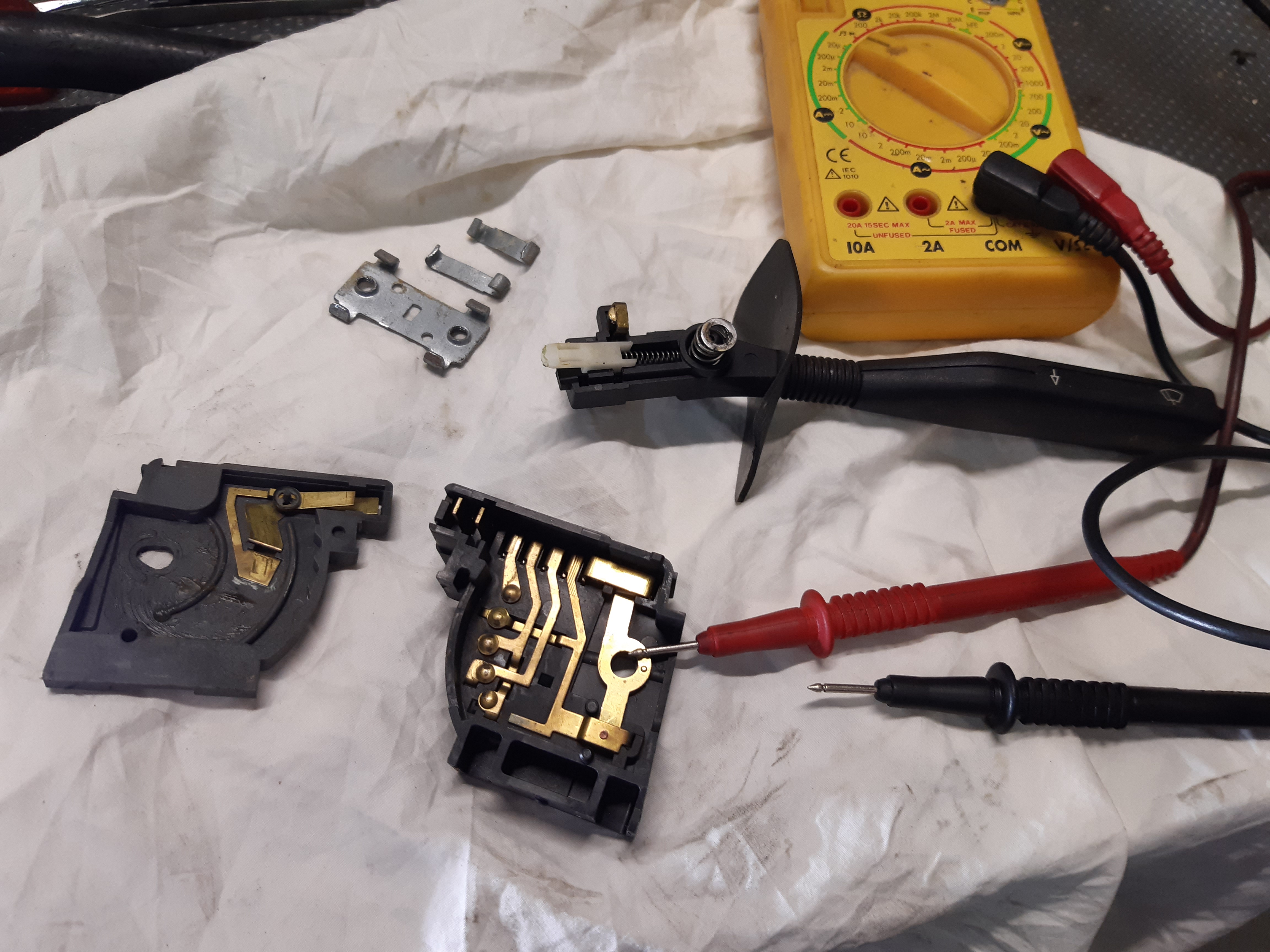 Plus de lave-glace depuis quelques temps,je voulais absolument le réparer depuis que j'ai pris de la gerbe sur l'auto :wacko: Après avoir tout testé, j,en suis arrivé à la conclusion que le soucis était dans le commodo...juste un mauvais contact ,un coup de lime de Genève et c'est reparti :ok:
