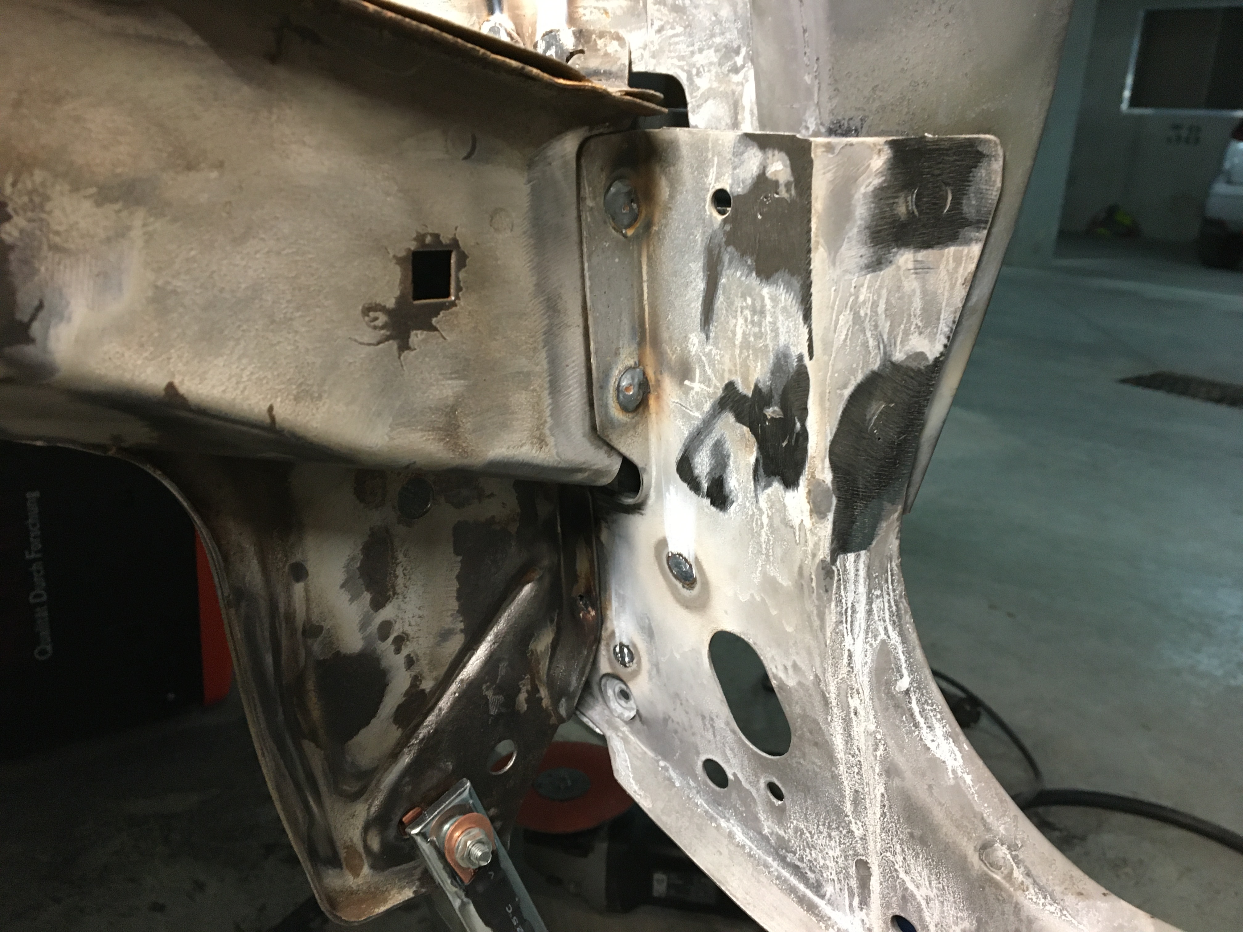 J’ai coupé autour des soudures pour être sûr de ne pas trop meuler. Finition et nettoyage des soudures ensuite. Le futur support moteur qui va bien.