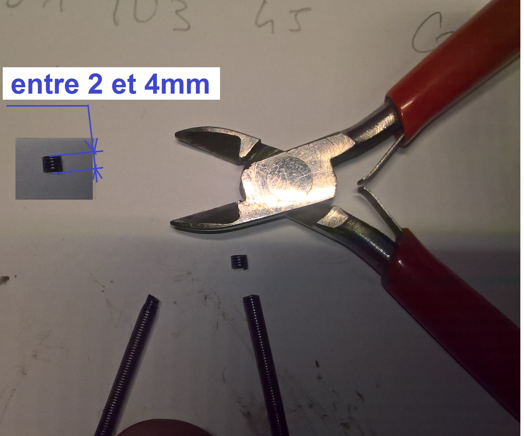 4 : avec une petite pince coupante, on retire 2 à 4 mm maxi de ressort, extrémité non "conique" du ressort