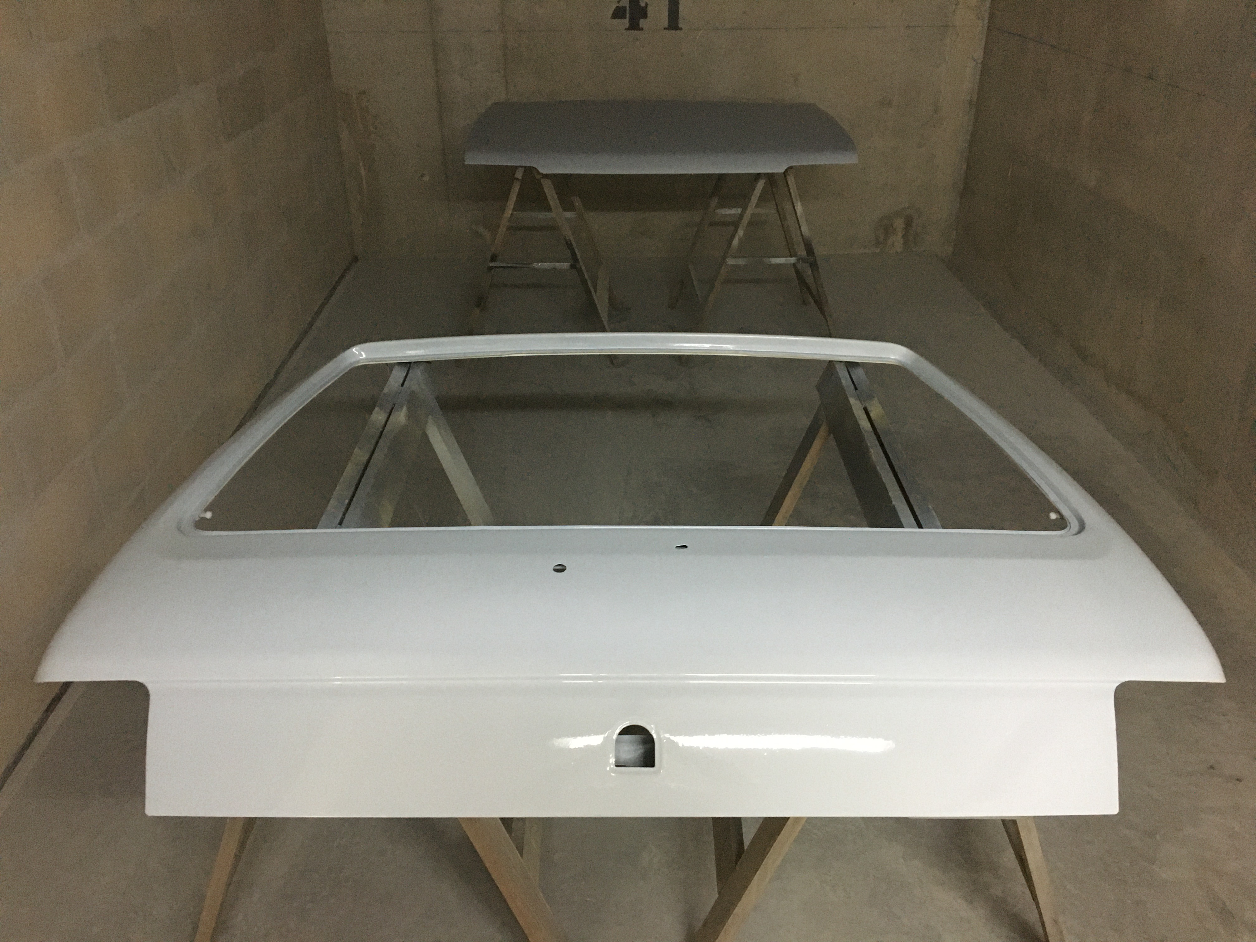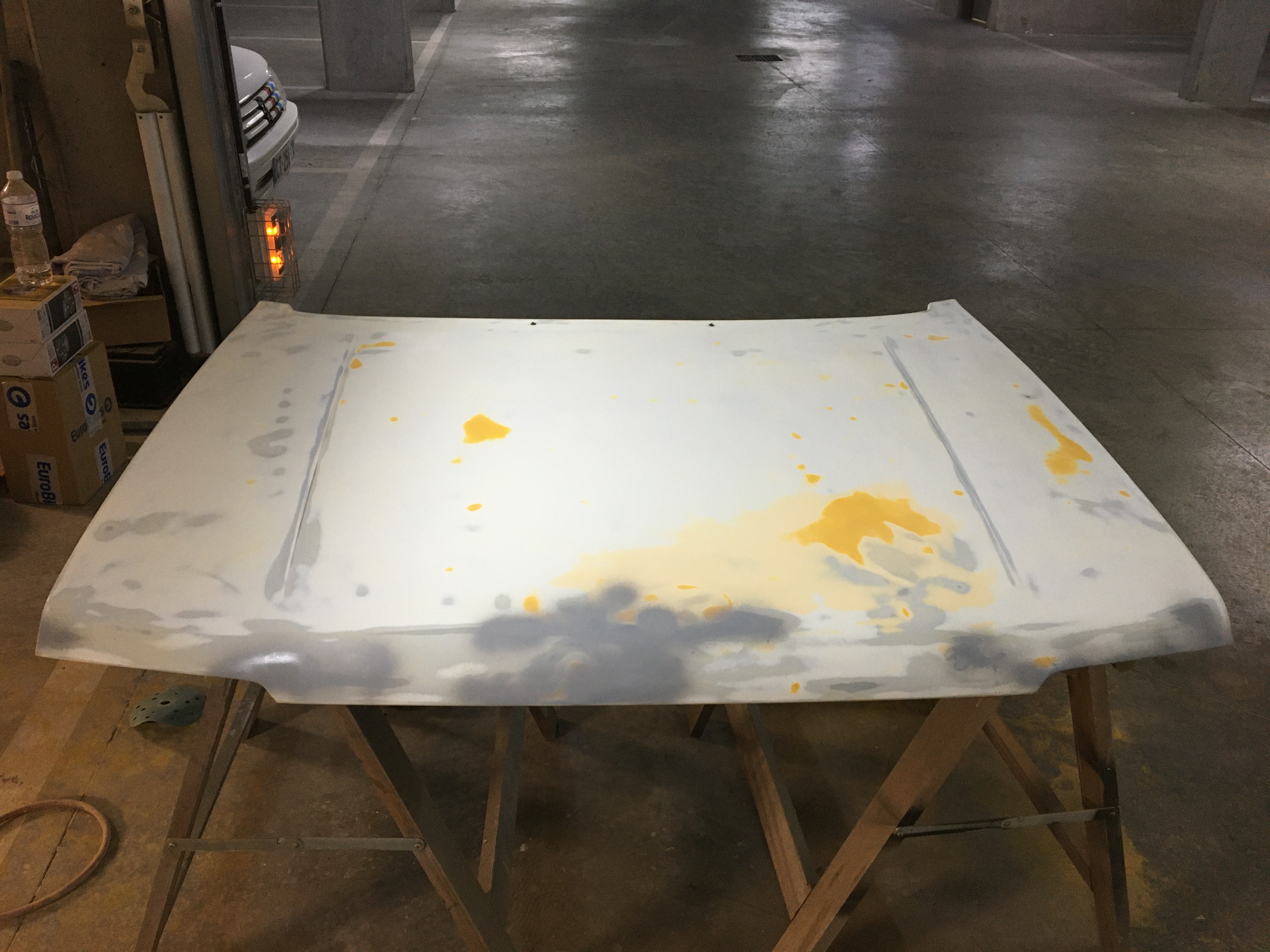Ensuite apprêt du capot et du hayon. Et maintenant ponçage à la grande cale et à l’eau au 600 pour commencer. Ça va être long. Il y a encore qqs défaut à gommer !!!
