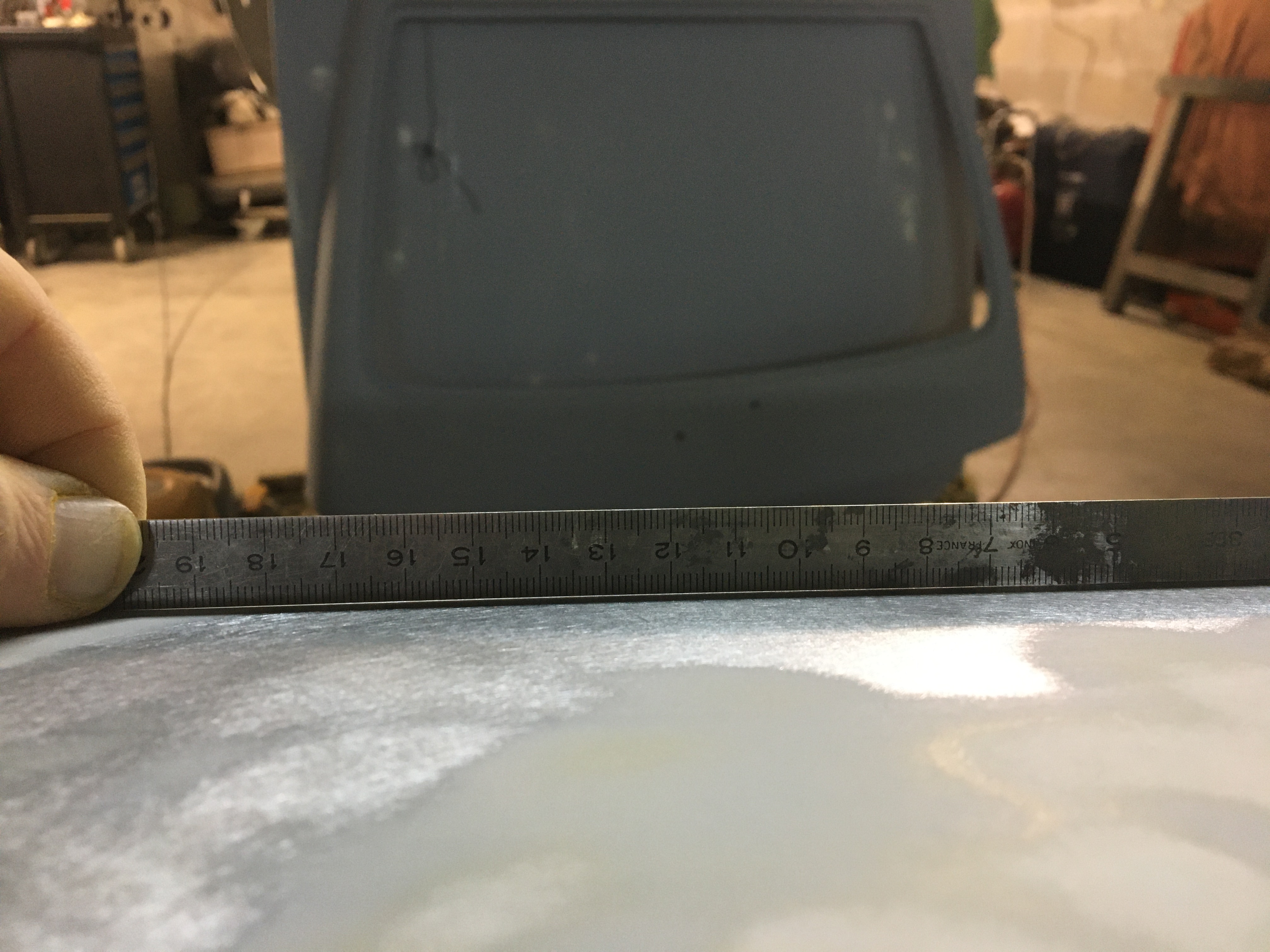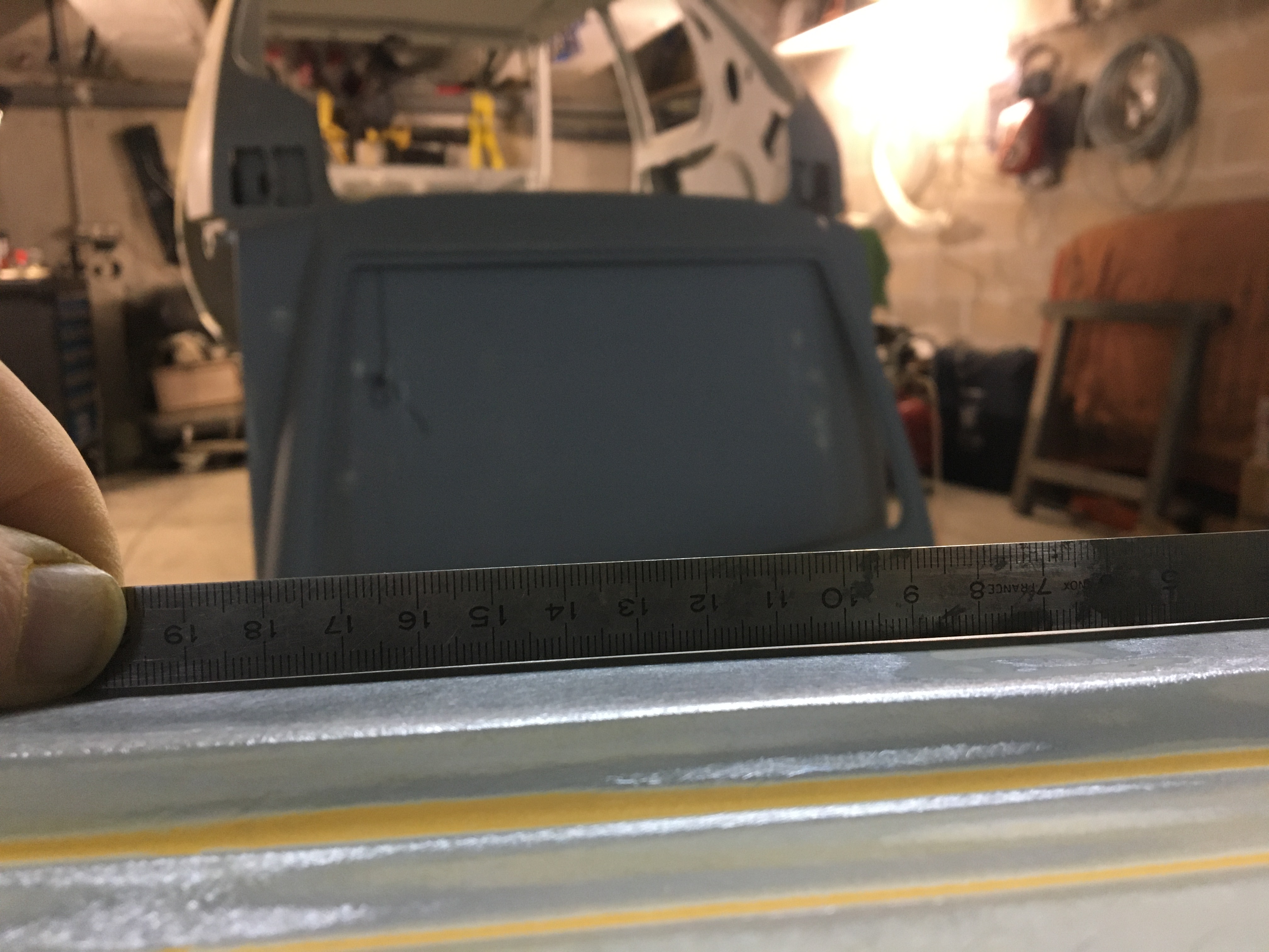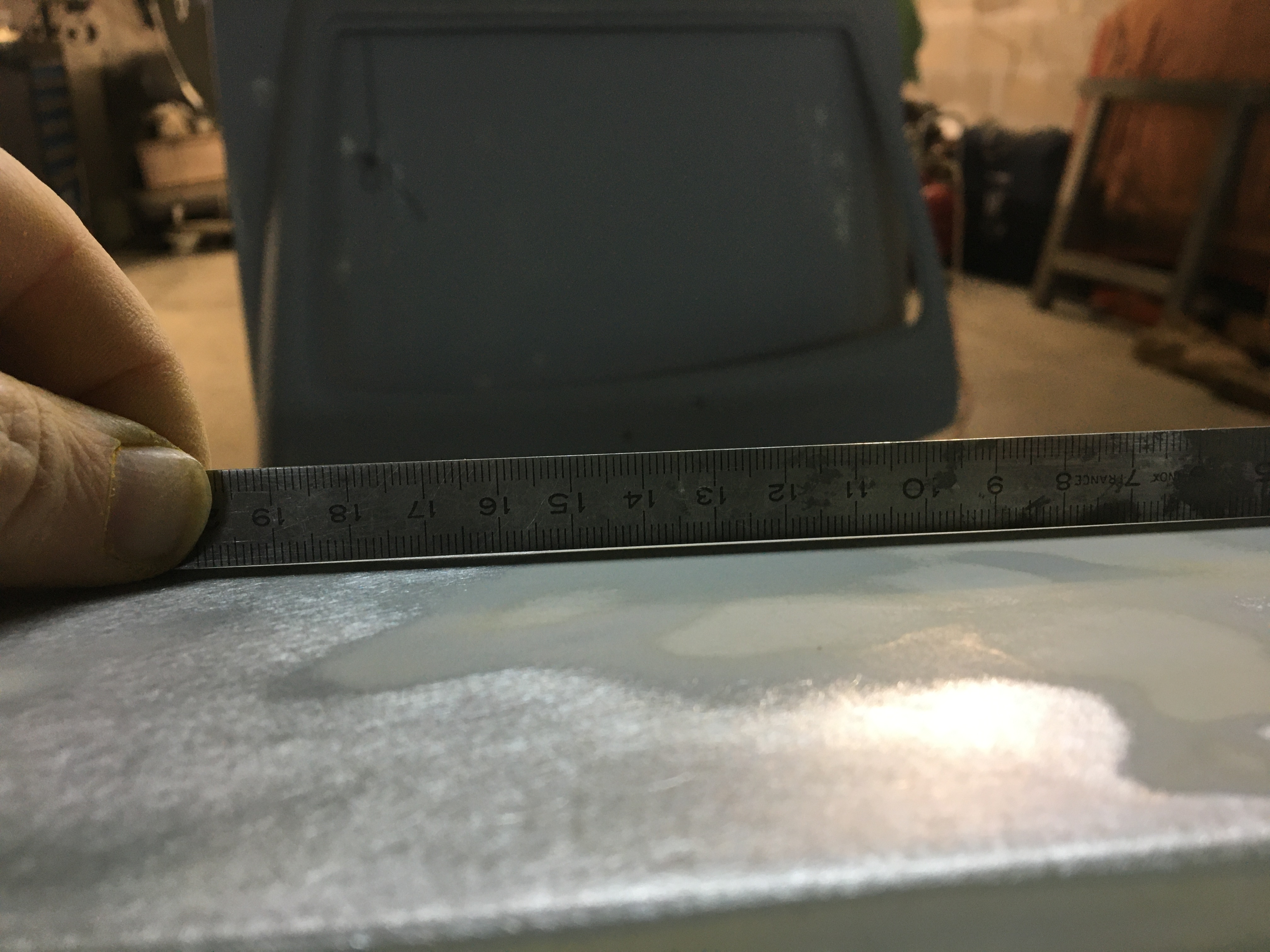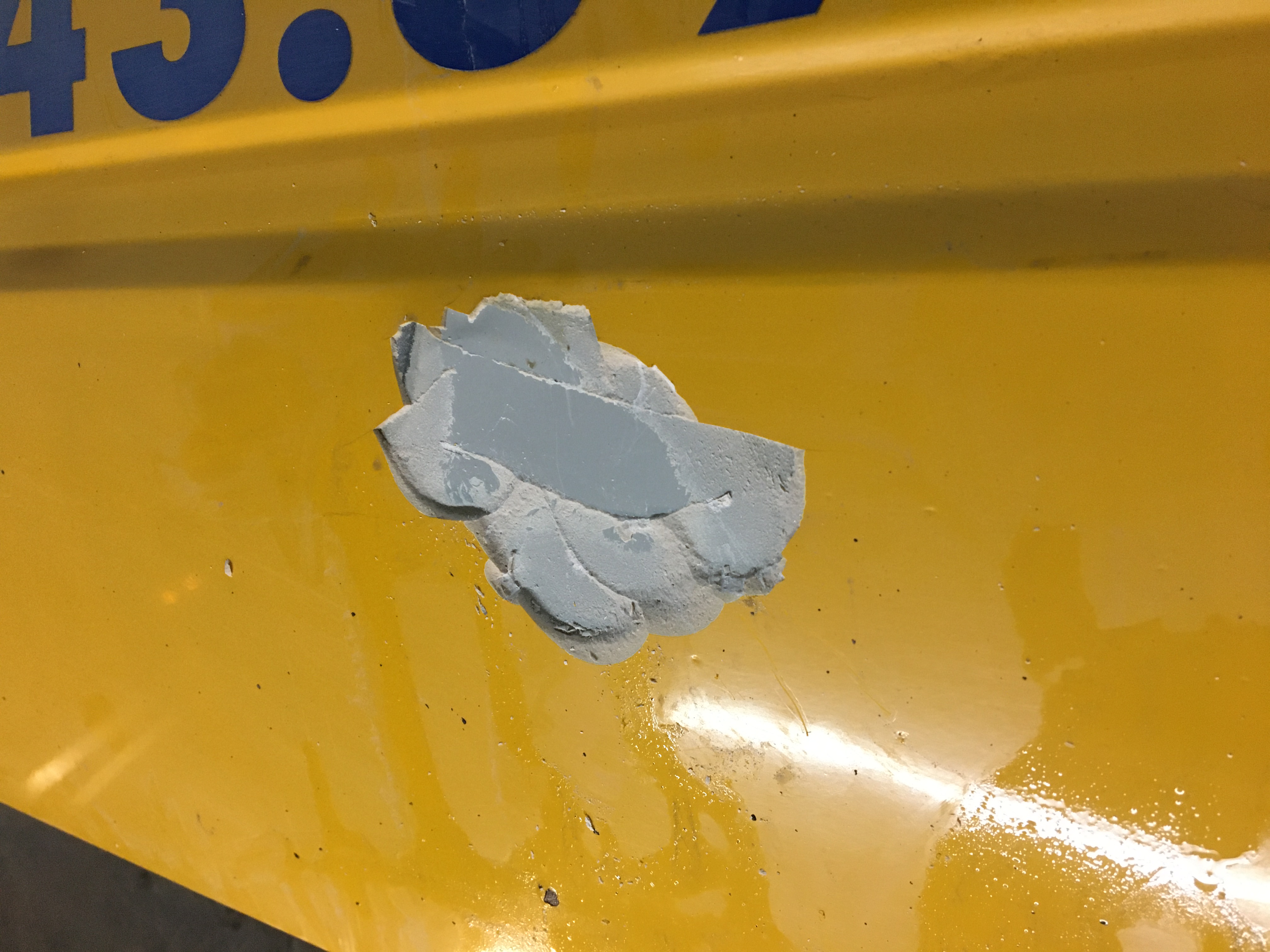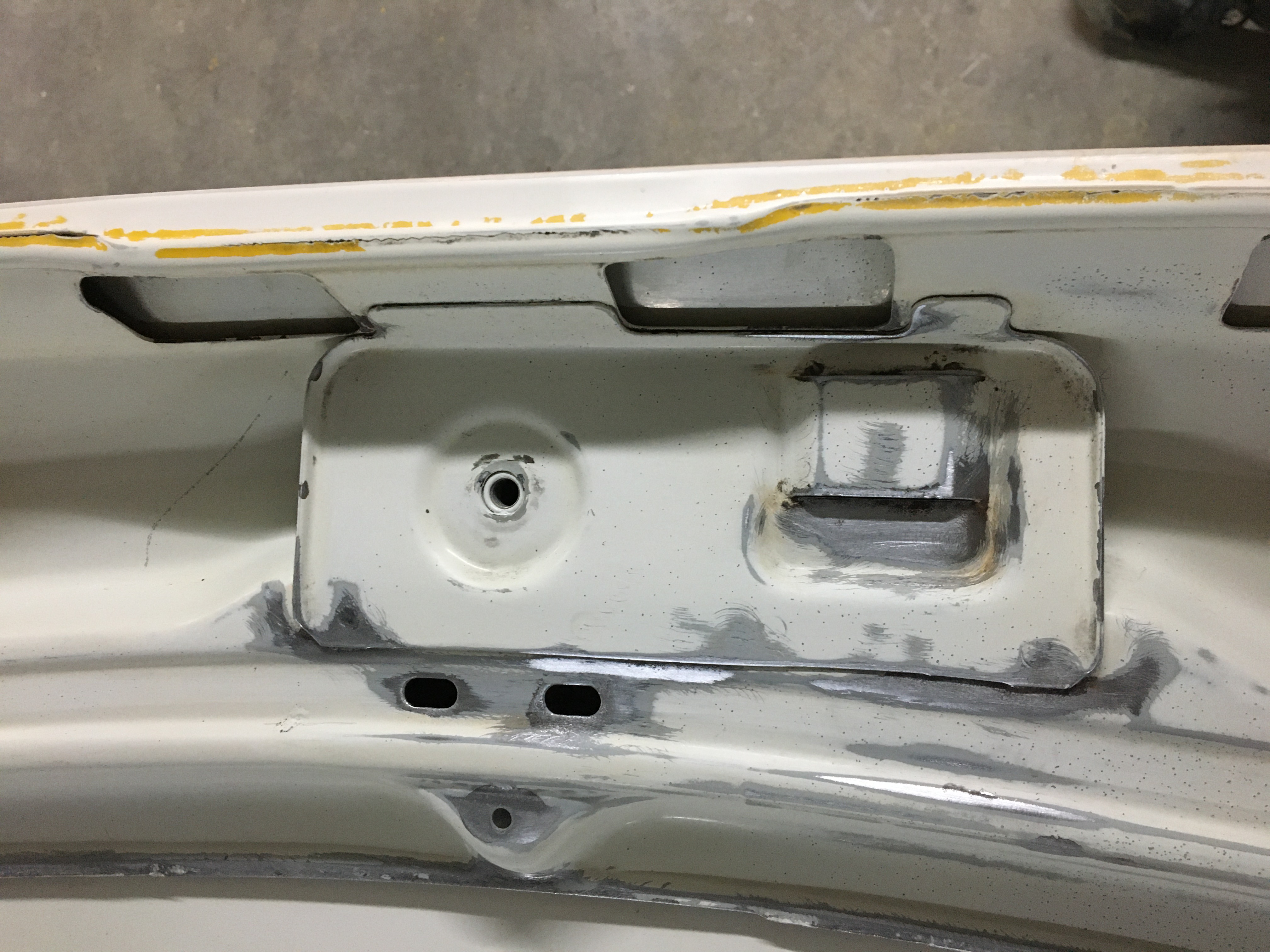 J’ai eu deux endroits comme ça. Un sur chaque porte. Jusqu’à 5 mm de sinto. Voilà celle où il y avait les 5mm après ponçage et redressage. C’est pas mal revenu. Le reflet donne un bon aperçu de ce que m’apprête garnissant aura comme creux à combler. Mais je n’ai pas réussi à avoir toutes les parties comme ça !! Le mastic polyester est malheureusement obligatoire.