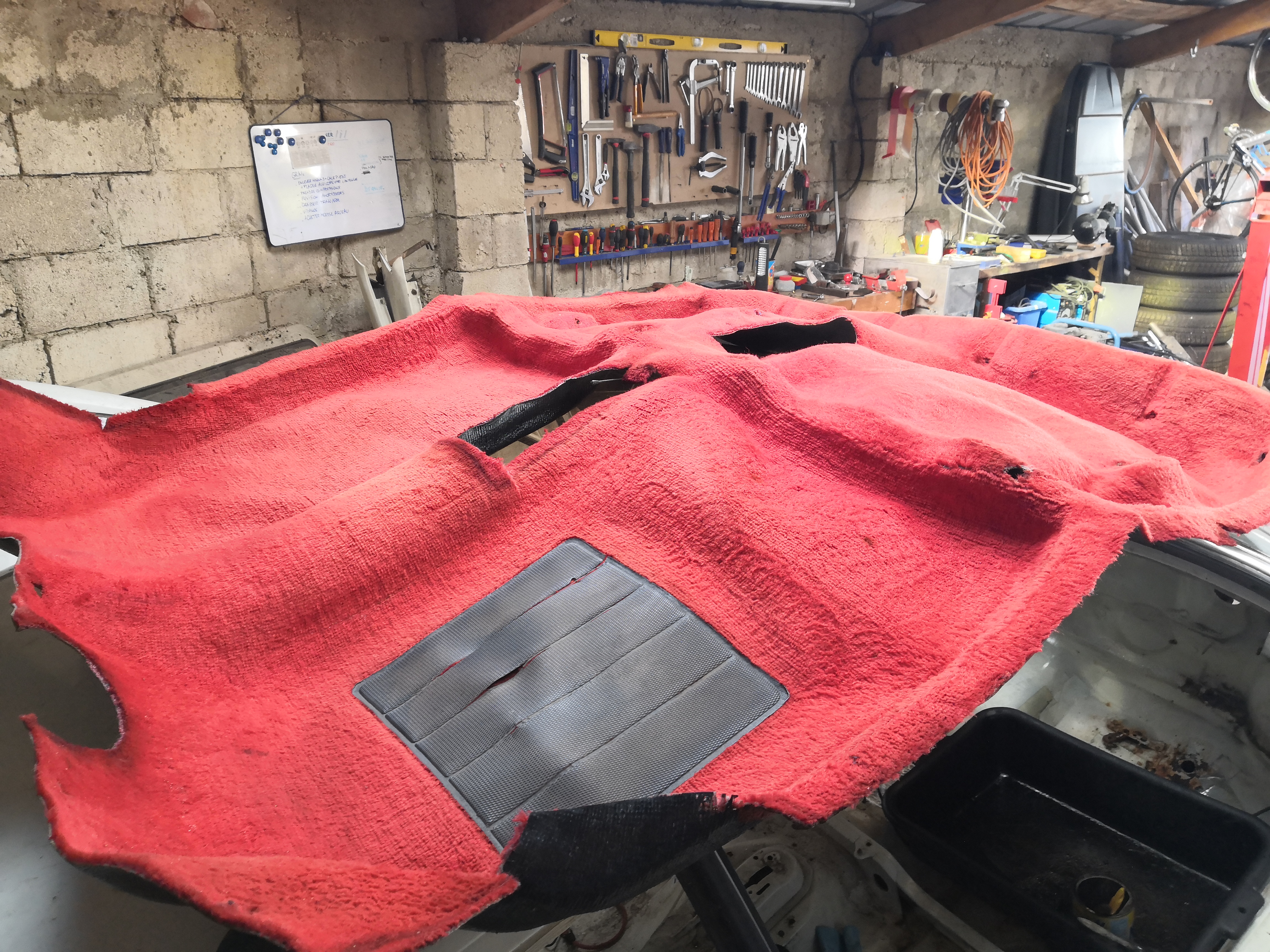 La moquette a meilleure allure. La mécanique est prête. Et la caisse est presque prête à partir à la poubelle, reste les contre ailes à récupérer.