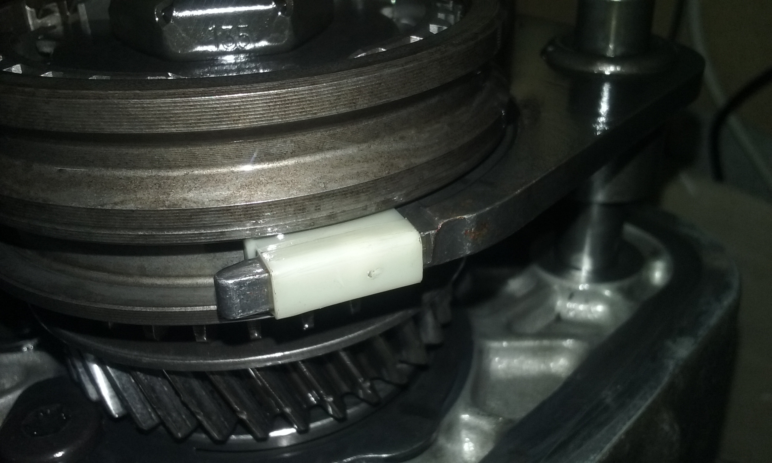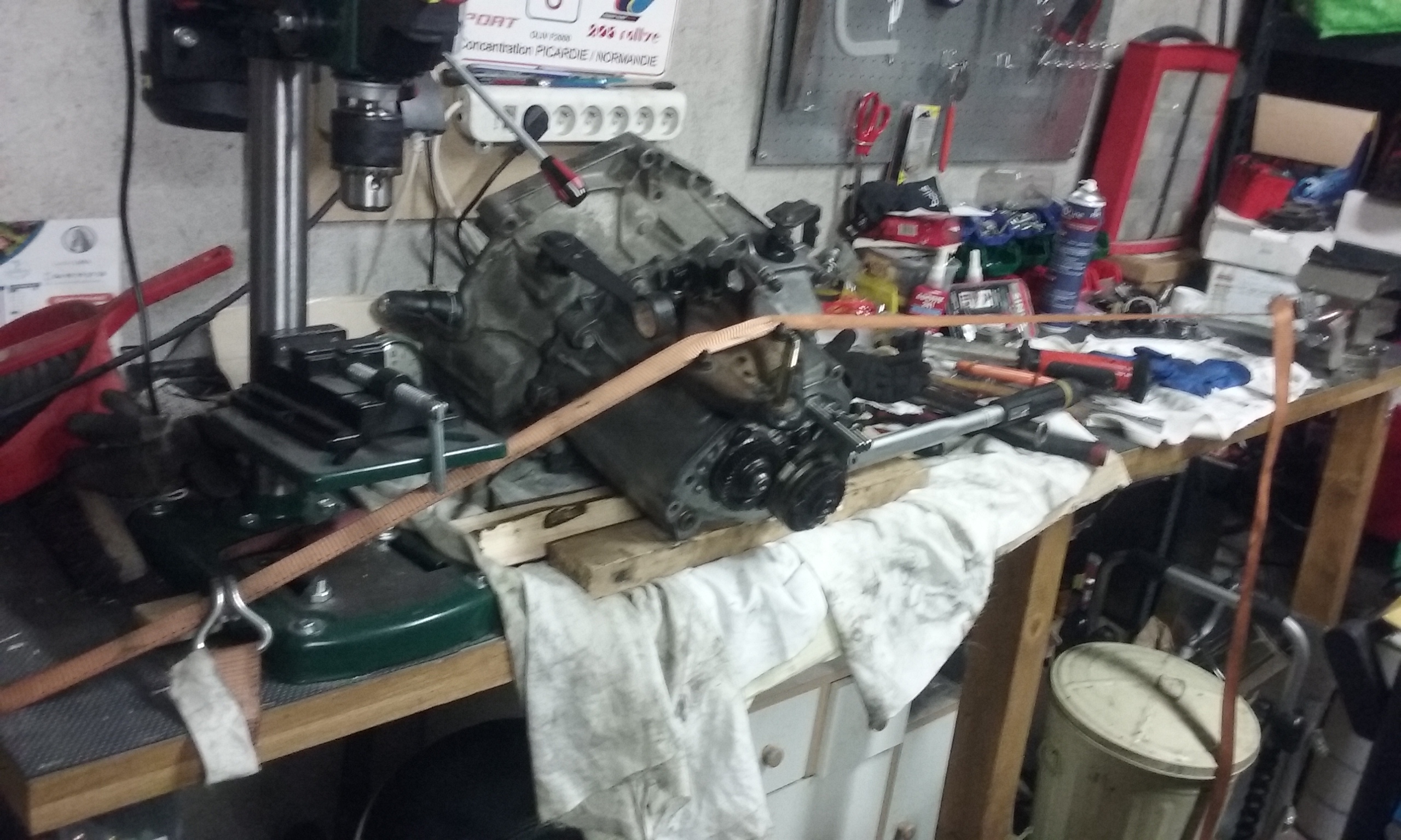J'ai du brider la boîte sur l'établi avec une sangle à cliquet pour serrer l'écrou de bout d'arbre secondaire