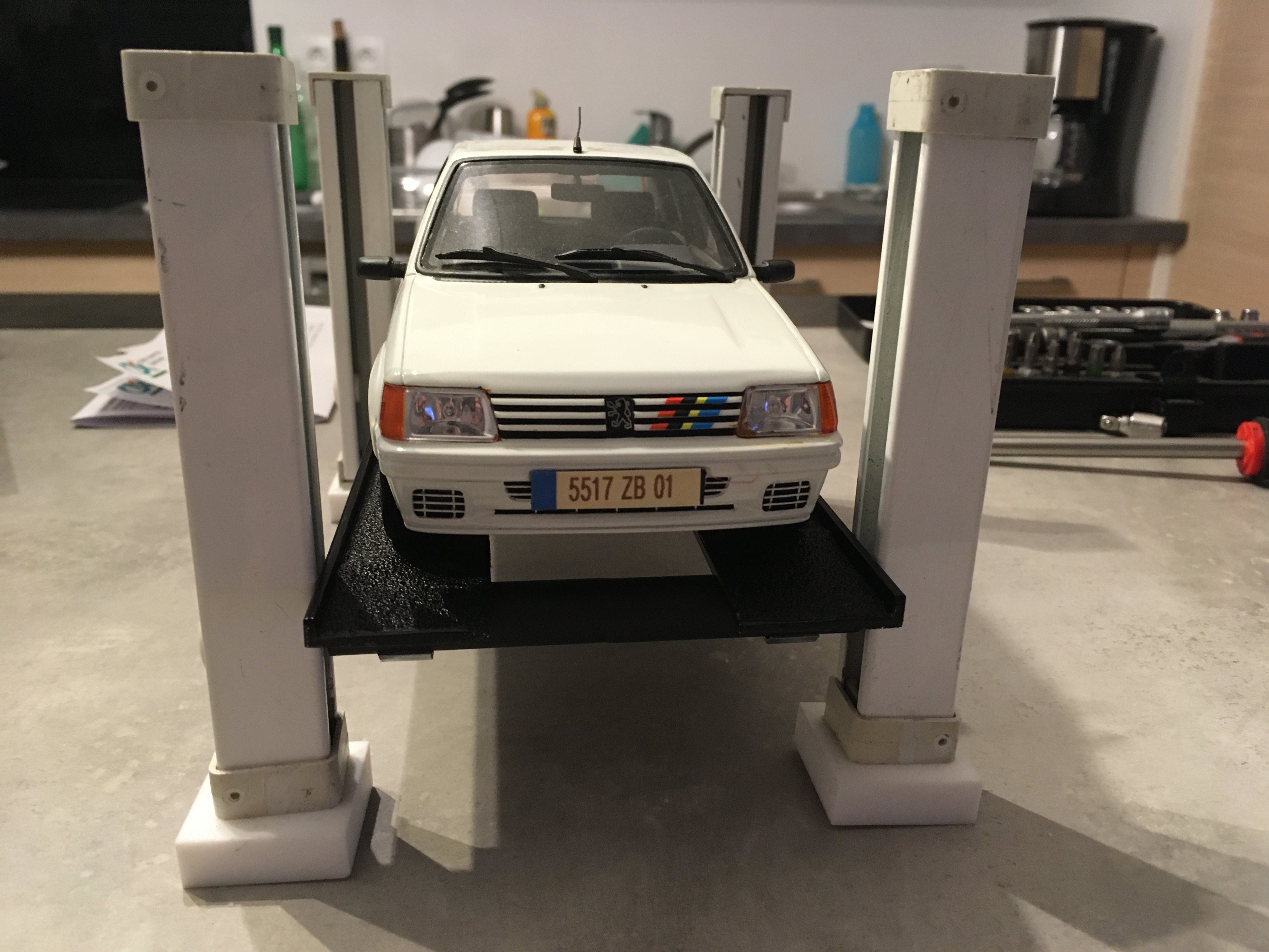 Montage à blanc du pont 4 colonnes fait avec des tringles à rideaux et d’autres pièces diverses et variées… Réglables en hauteur, il sera peint orange , jaune ou bleu : de la couleur d’un pont quoi