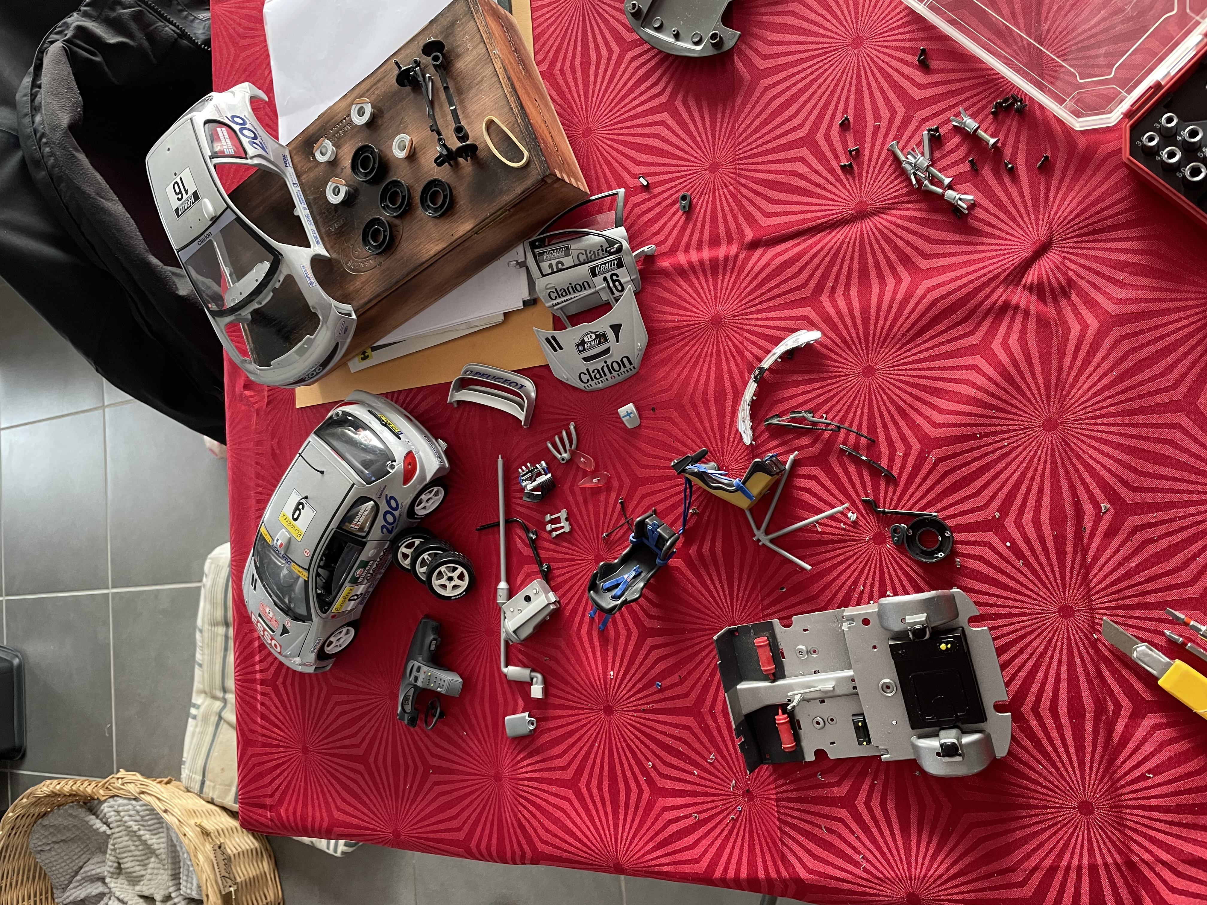 J’ai trouvé ça à la brocante ce matin , 8 € les deux … Du coup j’en mets une en pièces , l’autre reste tel quel et je refais un petit garage simple : chandelles / roues / capot / portières …