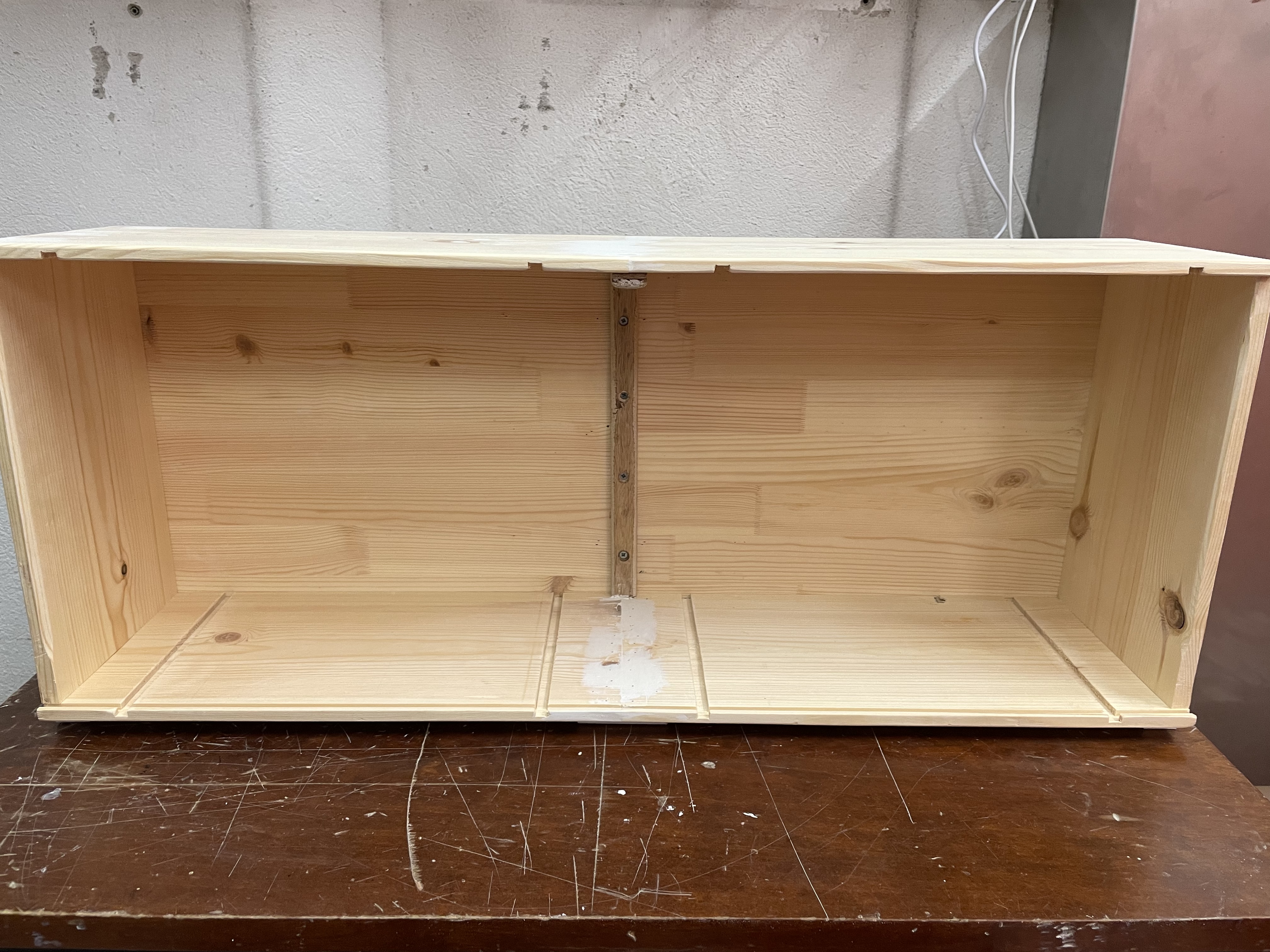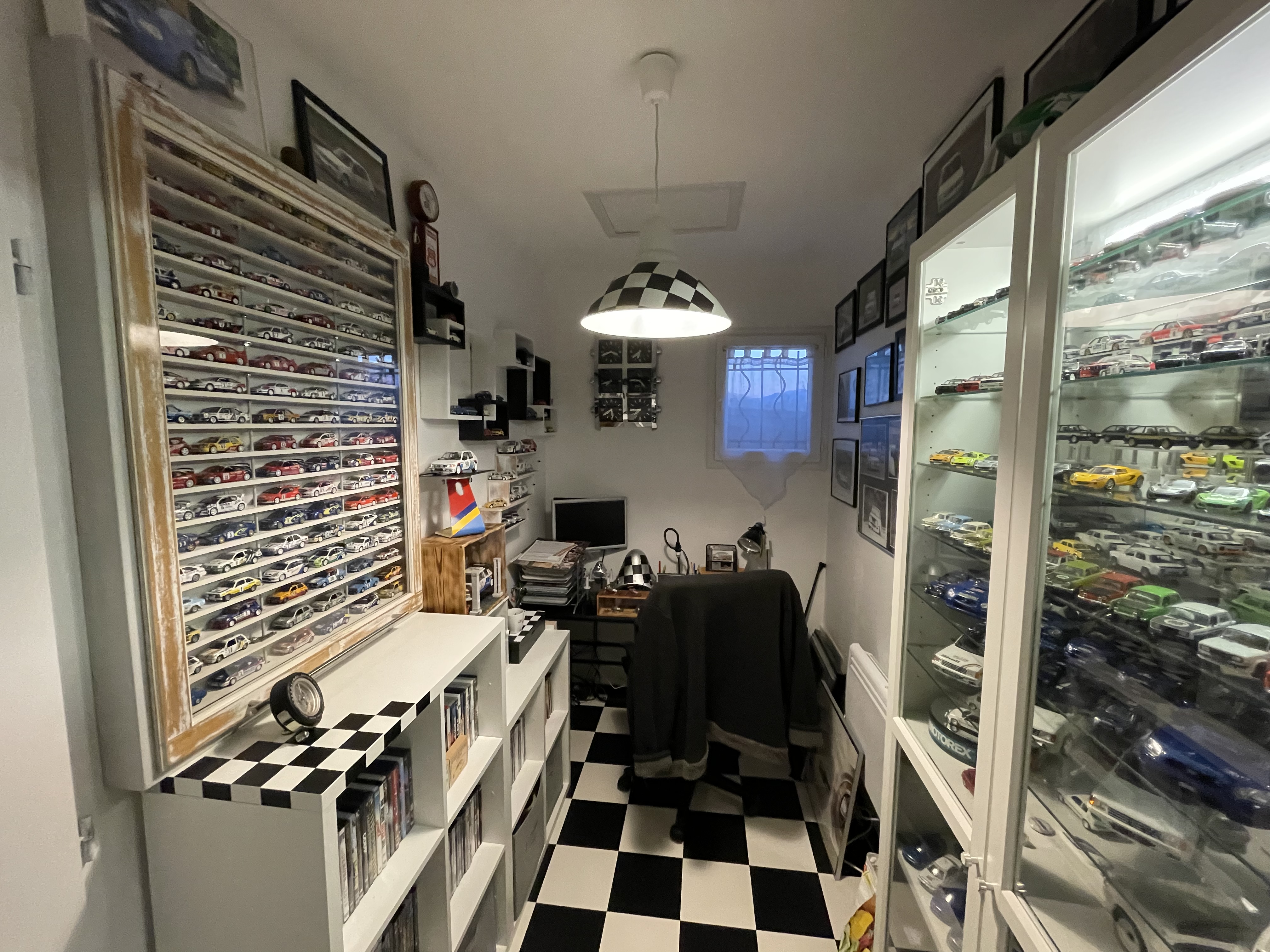 On continue le délire. Vu la GRANDEUR du garage, j’ai mis un petit « établi » au fond qui servira à stocker les roues et un support tuyau d’air avec son tuyau.