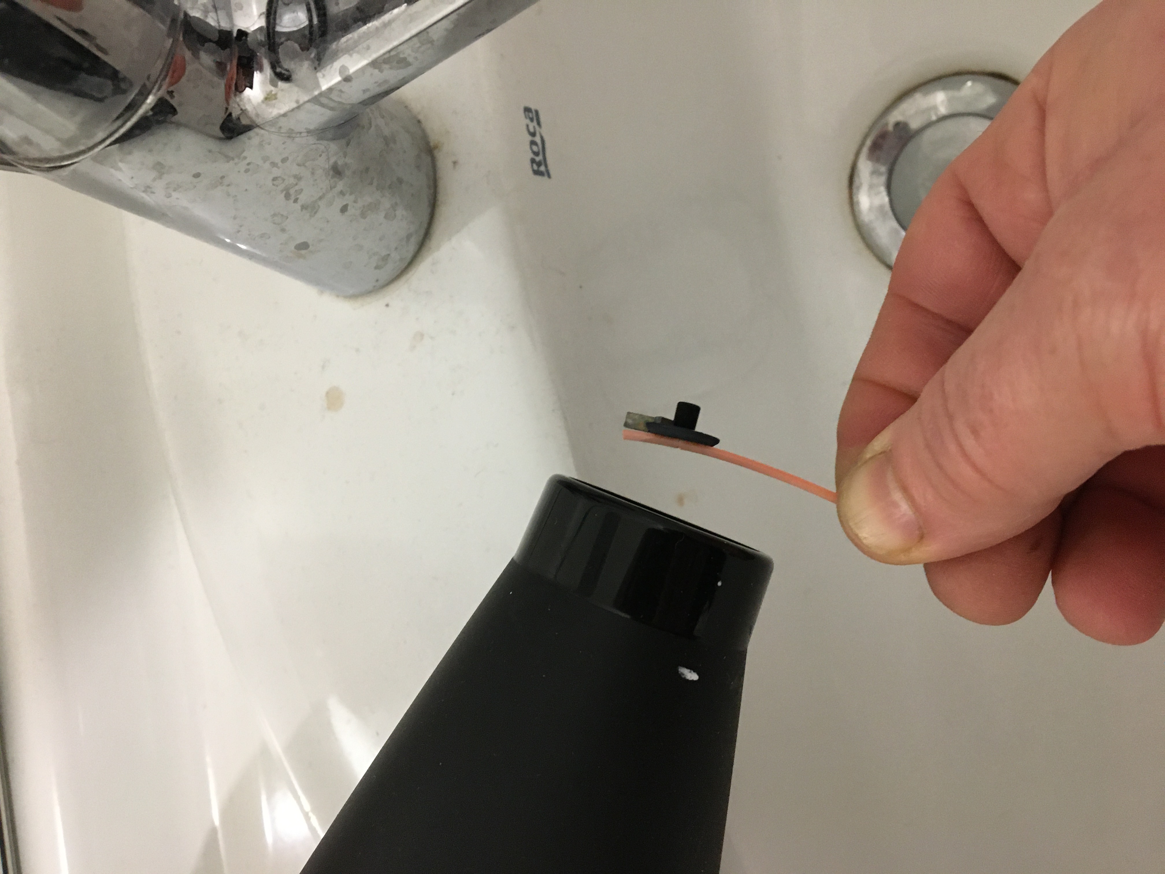 Et puis j’ai fait un essais au sèche cheveux. Et là, ça fonctionne bien. On se chauffe un peu les doigts mais ça marche. Une fois le plastique ramolli, on le remet en forme le mieux possible. Et ça donne ça.