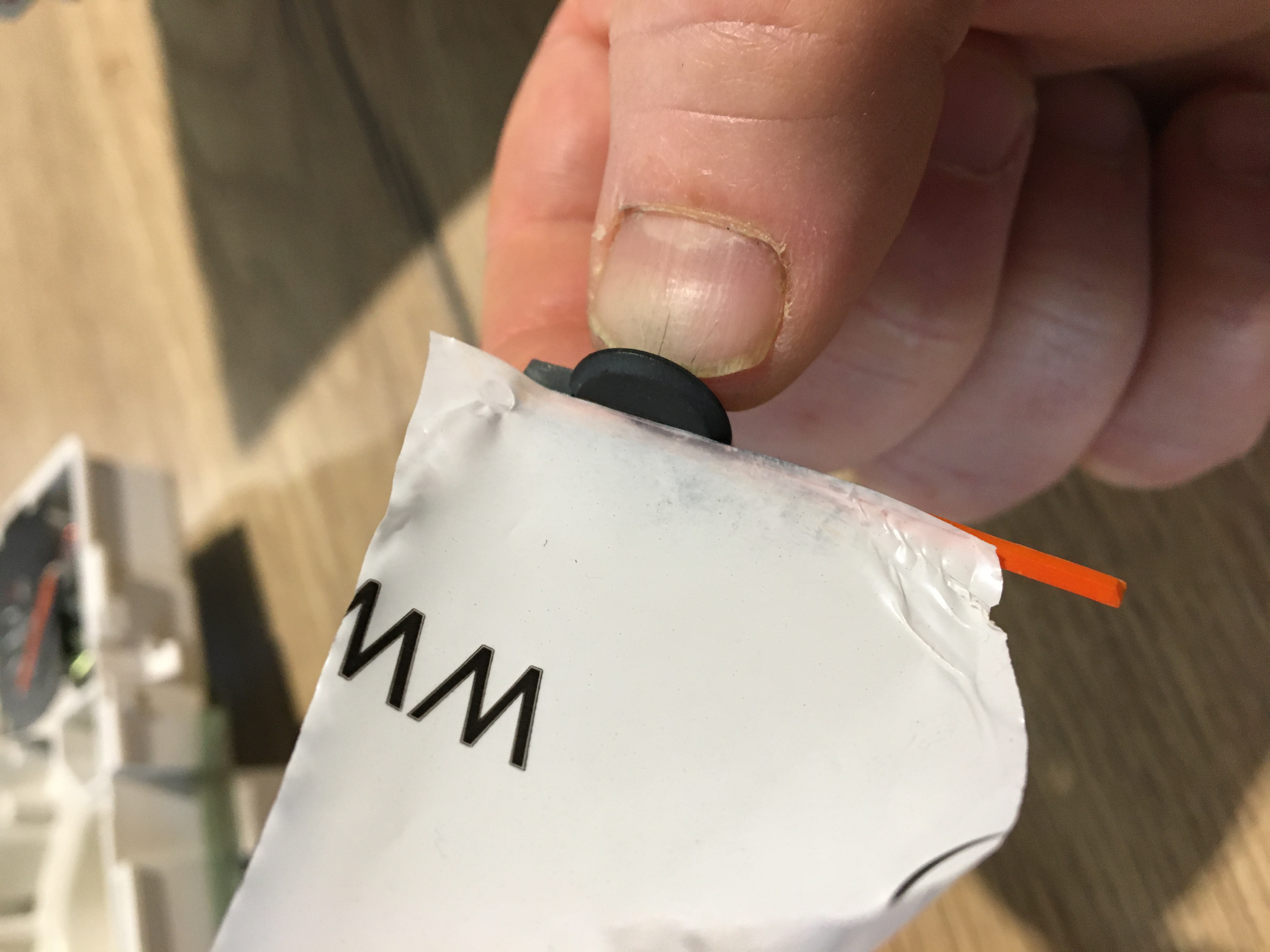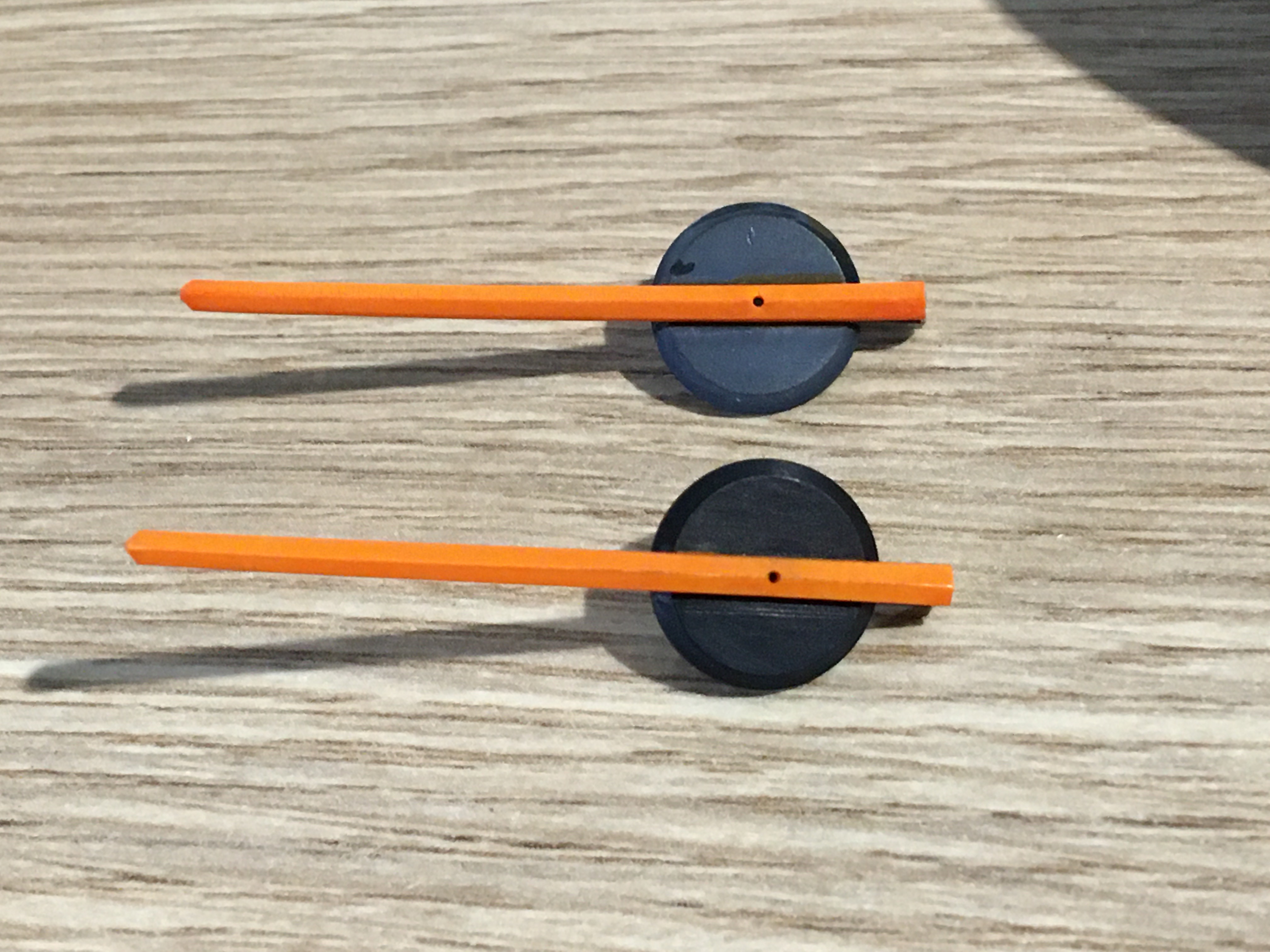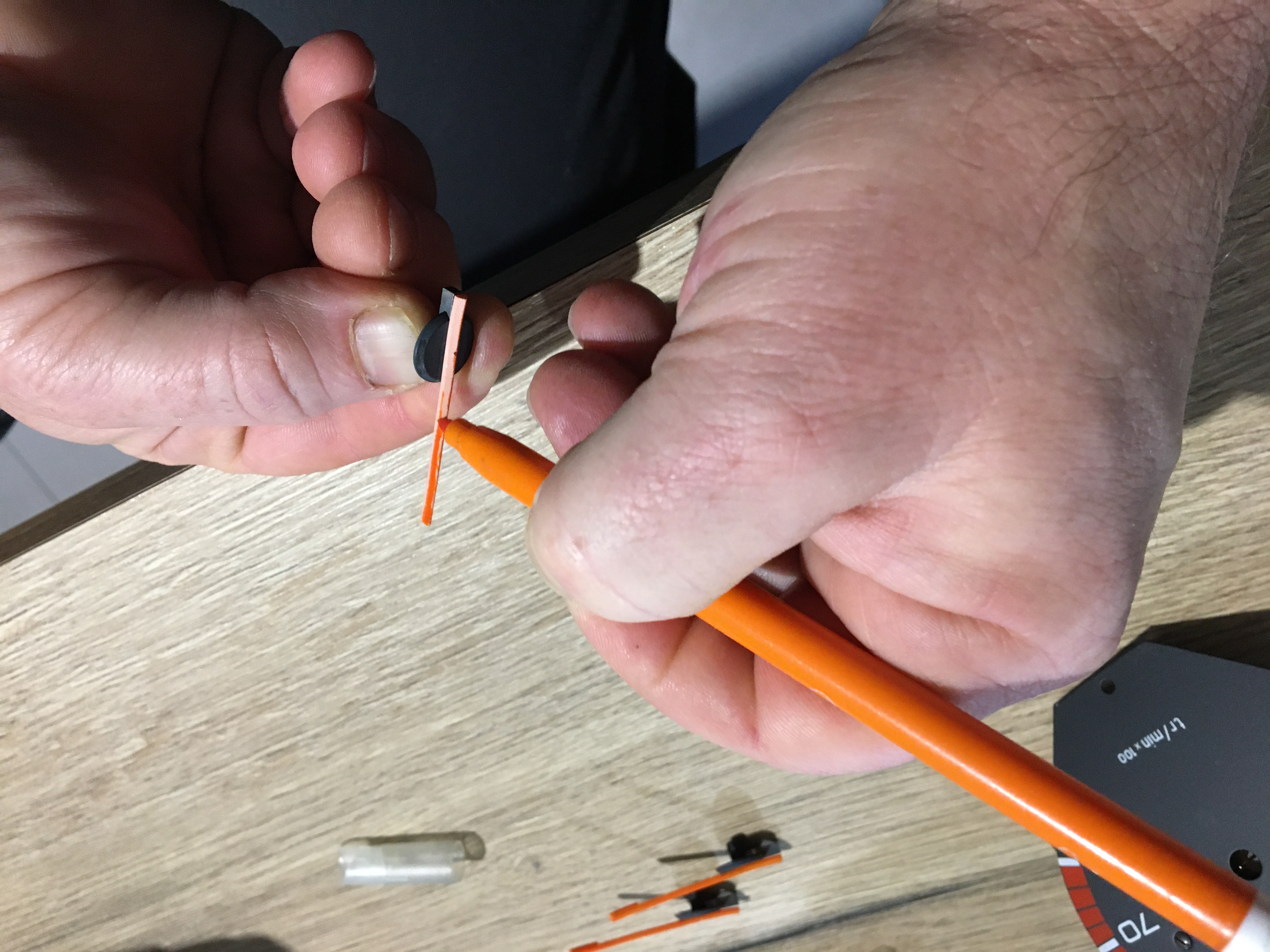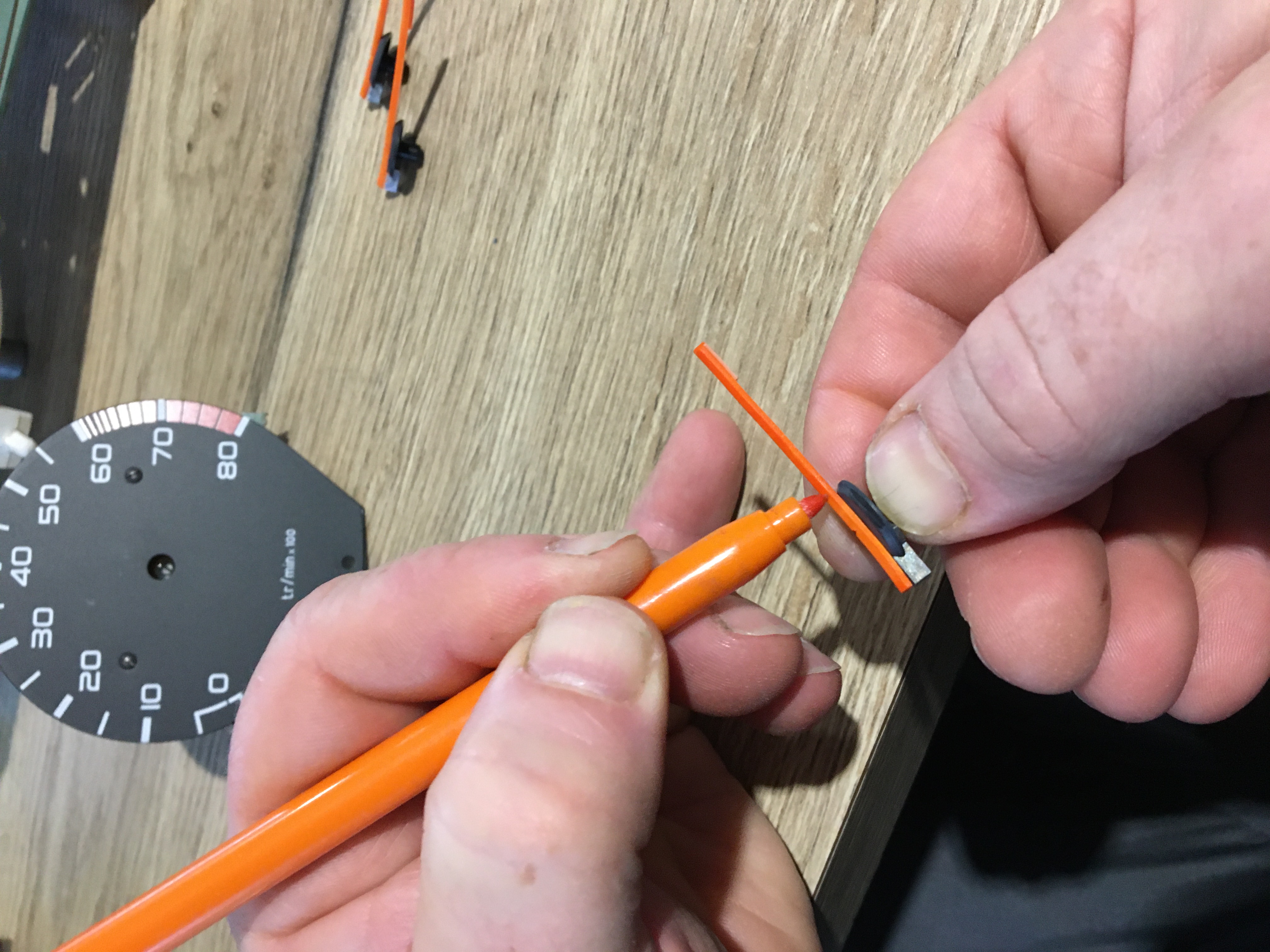 Alors un feutre orange pour l’aiguille et un gris très foncé pour son socle. Et pour faire le noir (ou gris foncé), un morceau de scotch pour faire ça propre. Je passe le feutre et je ressui direct avec un petit pinceau sec. Ça uniformise la pose de la couleur.